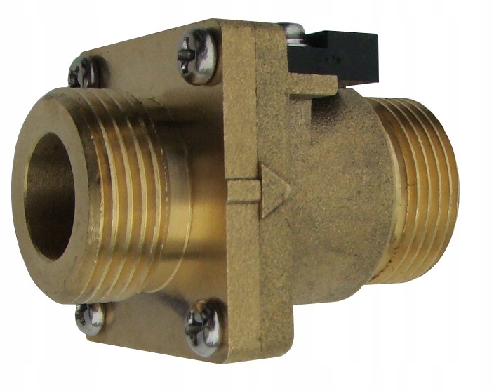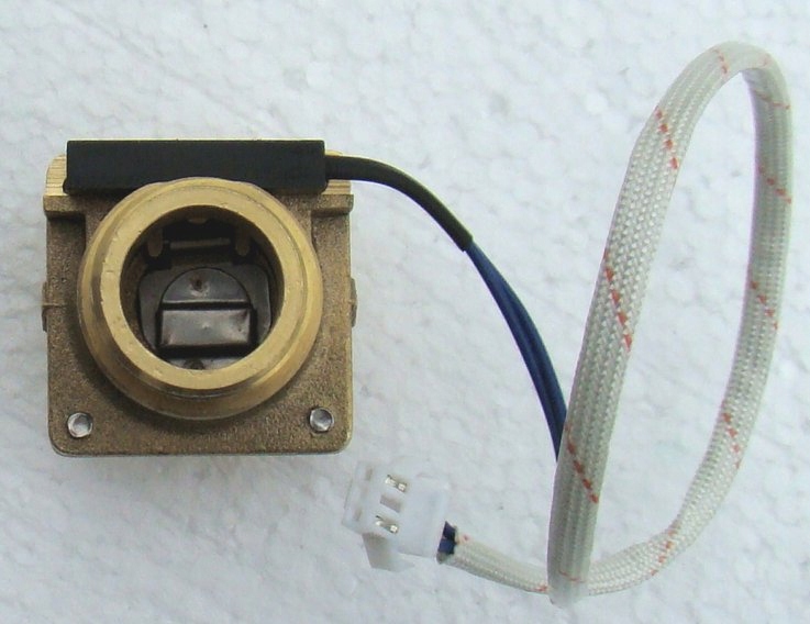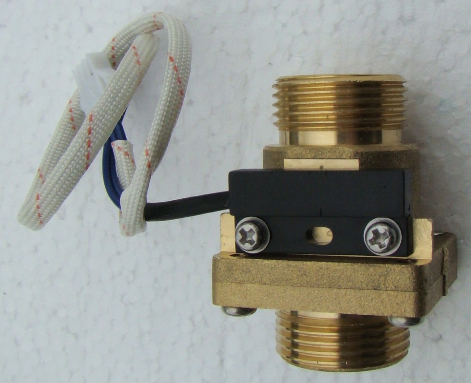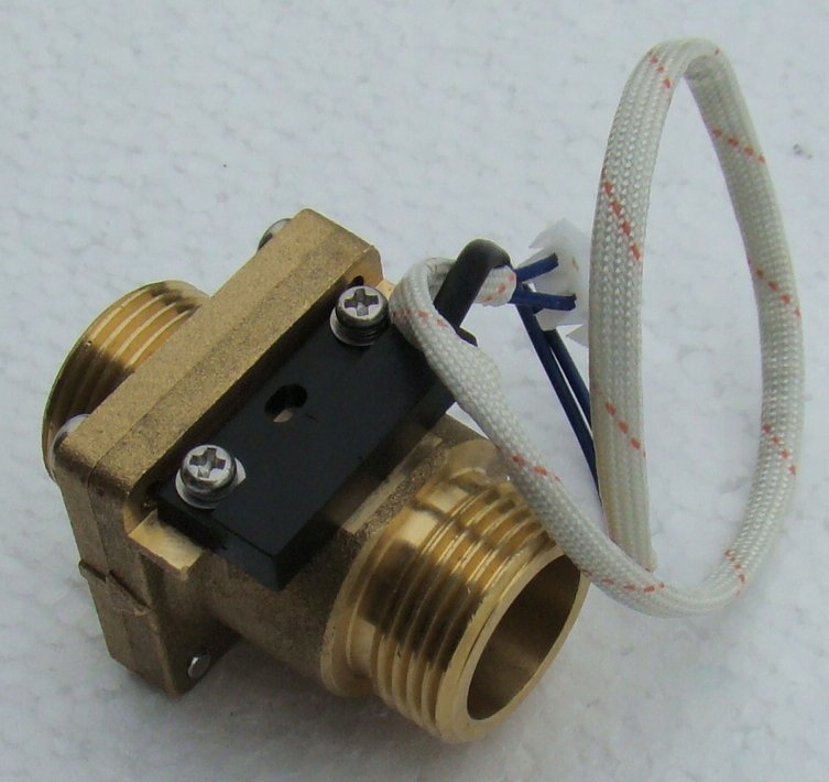 Датчик має з’єднання 3/4 дюйма з обох боків і 2-жильний кабель. Напрямок потоку рідини позначено на датчику стрілкою. Його можна монтувати вертикально – тоді вхід повинен бути знизу. Ви також можете встановити його горизонтально - тоді змонтуйте його так, щоб кабельний вихід був угорі, як показано на фото нижче. Звичайно, щоб уникнути турбулентності потоку в трубі, ділянка труби до та після датчика має бути прямою (мінімум 6-7 діаметрів труби), тому біля датчика не може бути колін, трійників, клапанів тощо.