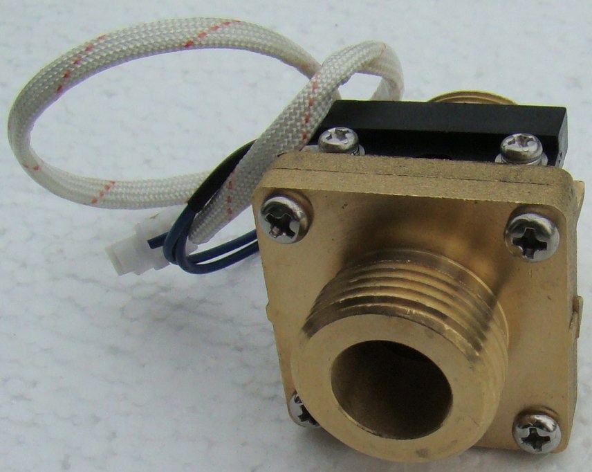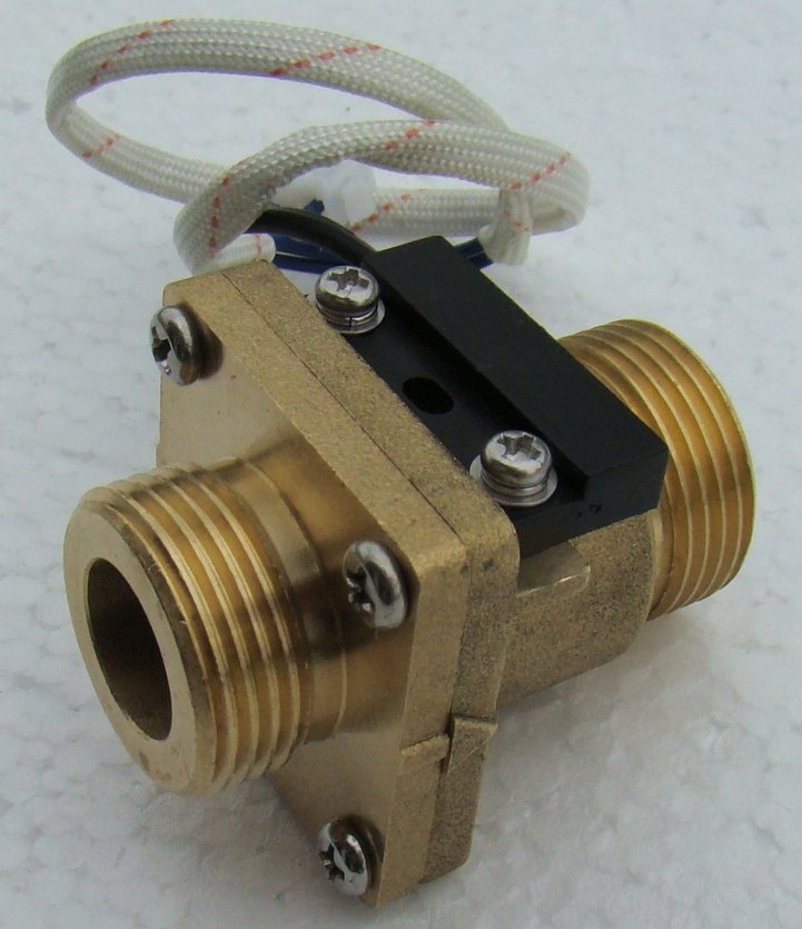 Датчик має з’єднання 3/4 дюйма з обох боків і 2-жильний кабель. Напрямок потоку рідини позначено на датчику стрілкою. Його можна монтувати вертикально – тоді вхід повинен бути знизу. Ви також можете встановити його горизонтально - тоді змонтуйте його так, щоб кабельний вихід був угорі, як показано на фото нижче. Звичайно, щоб уникнути турбулентності потоку в трубі, ділянка труби до та після датчика має бути прямою (мінімум 6-7 діаметрів труби), тому біля датчика не може бути колін, трійників, клапанів тощо.