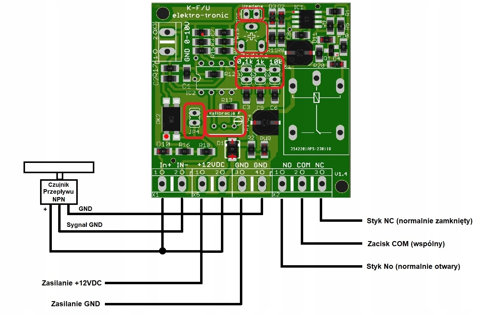 За відсутності сигналу від витратового проміжника, стип Com компактний з NC (і відкритий від NC), тоді як після виявлення сигналу від стику вимірювача буде компактною з NO (і відкритим від NC) протягом такого часу, поки вимірювання потоку дасть імпульси (як тривалий потік рідини)