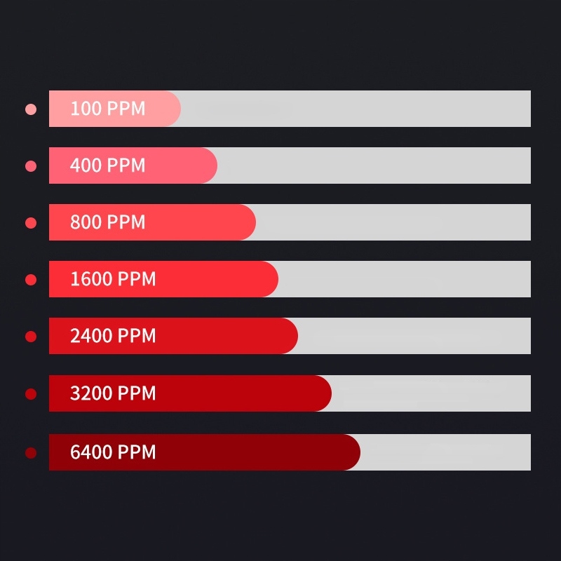Коли концентрація чадного газу перевищує 70 частин на хвилину, сигналізація чадного газу видасть гучний звук ≥85 дБ, а червоний індикатор спалахне, щоб попередити вас, що ви перебуваєте в середовищі з поганою якістю повітря. Зі збільшенням значення PPM діапазон часу тривоги буде скорочений. Оснащено функцією вимкнення звуку одним дотиком без турбування (натисніть кнопку «ТЕСТ», щоб вимкнути зумер). Проте з міркувань безпеки звуковий сигнал тривоги знову ввімкнеться через 6 хвилин, якщо концентрація CO продовжує перевищувати небезпечний рівень, навіть якщо звуковий сигнал будильника вимкнено. Безпека важливіша за все!