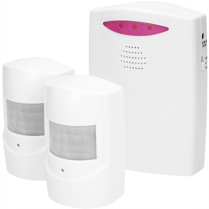 Бездротовий датчик руху (через радіохвилі) посилає імпульс на приймач, який сповіщає звуковим сигналом про виявлення руху в охоронюваній зоні. Пристрій дозволяє контролювати вхідні двері, які знаходяться в іншому приміщенні або будівлі. Встановлення датчика руху поза будівлею дозволяє контролювати рух в межах його поля зору. Ідеально підходить для огляду проходів, складів, підвалів, коридорів, під'їздів і парковок.