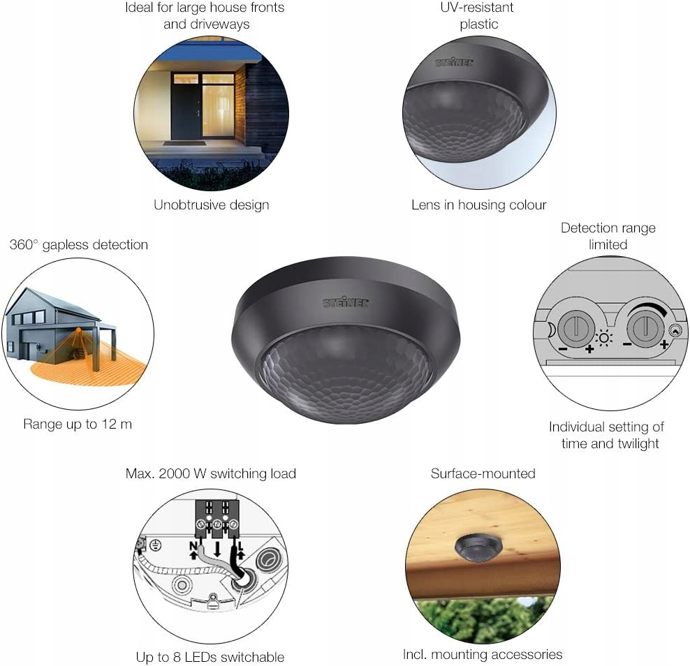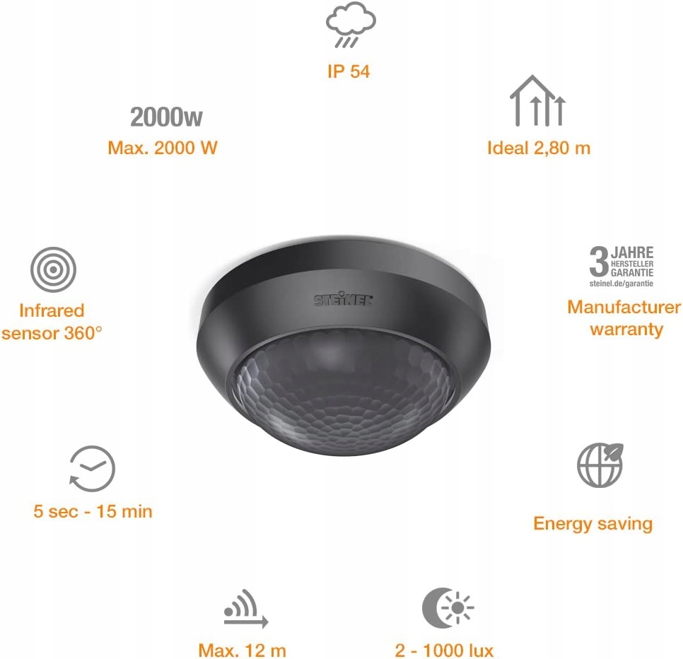Датчик руху Steinel Is 360-3, потужність 2000 Вт, кут виявлення 360°, датчик PIR, радіус дії до 12 м, підходить для світлодіодного освітлення, монтаж на стелі, напруга живлення 240 В