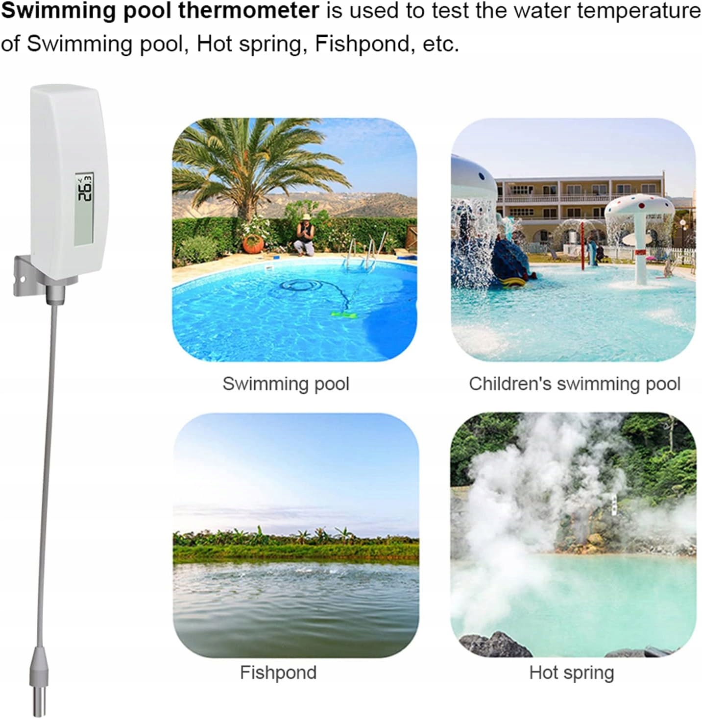 - Висока точність: цей діапазон температури термометра води: -40 ~ 60 ° C (40 ~ 140 ° F); Він фіксує широкий температурний діапазон можна прочитати в ступенях Цельсія або Фаренгейта. Довжина кабелю, підключеного до зонда, становить 3 м розширювального шнура з довжиною 3 м. Дозволяє точні вимірювання температури навіть у найглибшому пулі.