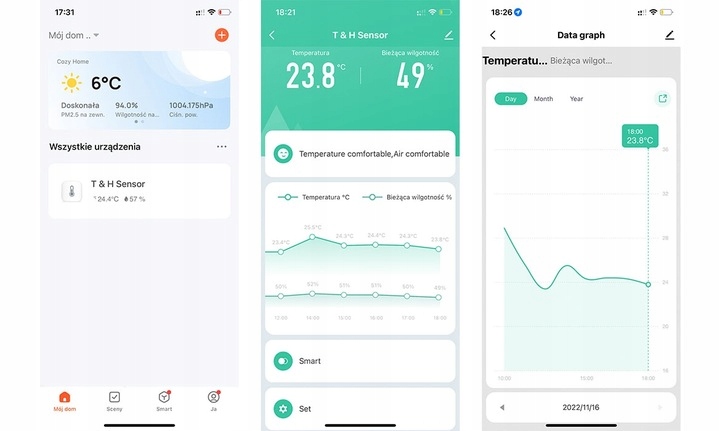 Датчик температури та вологості дозволить вам контролювати температуру під час підключення до домашньої мережі або віддалено з будь-якої точки землі. Крім того, ви можете легко надіслати звіт про показання температури собі, вказавши адресу електронної пошти, і створювати інтелектуальні сцени, такі як увімкнення газового котла чи теплового насоса, на основі показань датчика (для цього вам також потрібне відповідне реле. Компактний розмір 70x25x20 мм також дозволяє встановити його де завгодно — це один із найменших датчиків температури.