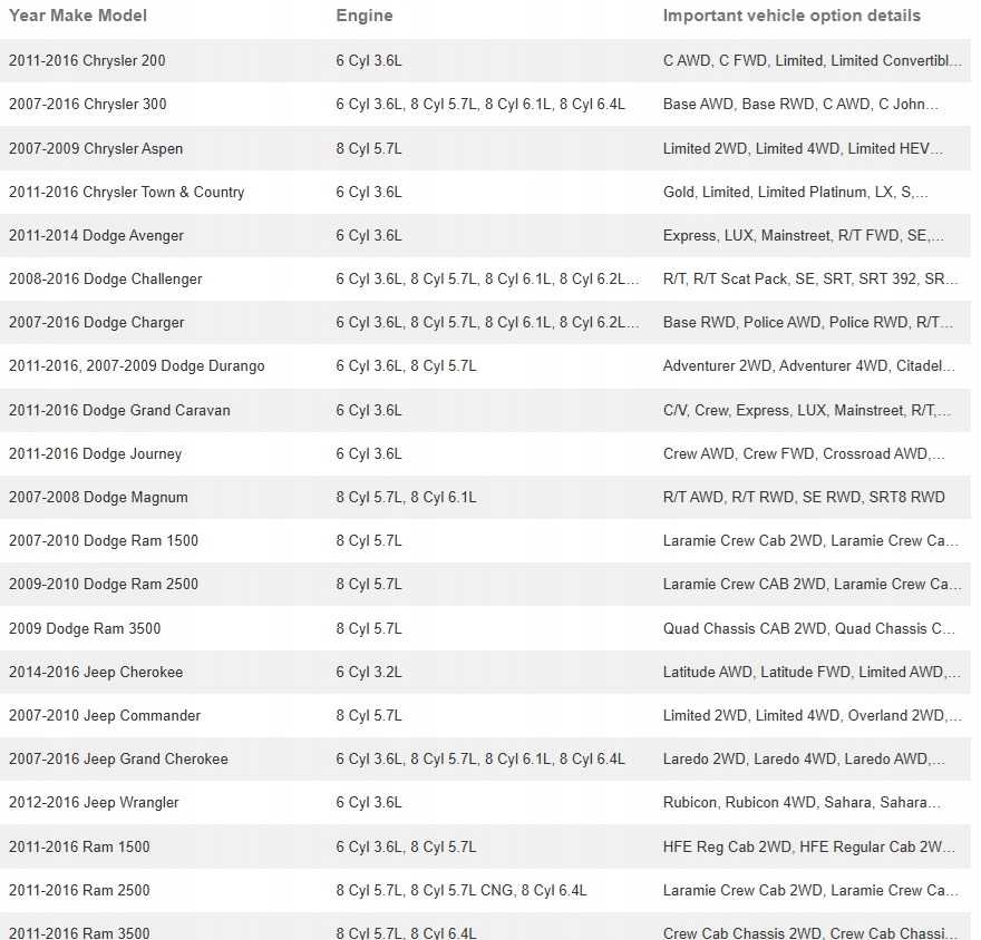 - 2012 Wrangler, Rubicon, Sahara, Sport, Unlimited Rubicon, Sahara, Sport, 3.6L V6. Двигуни 6,1 л, V8 6,4 л вищезазначених марок (відповідно до специфікацій, наведених нижче)