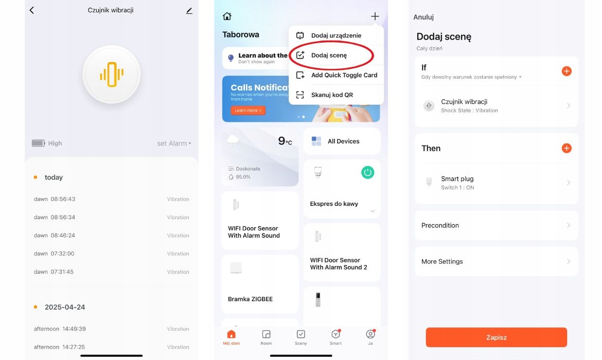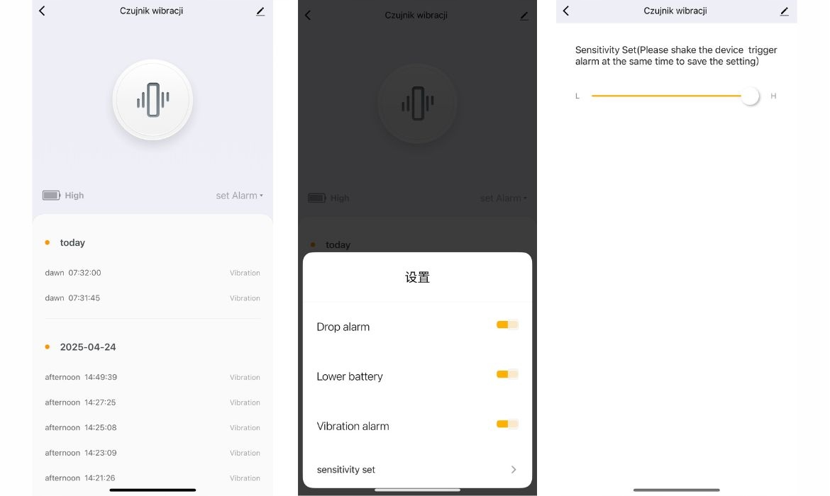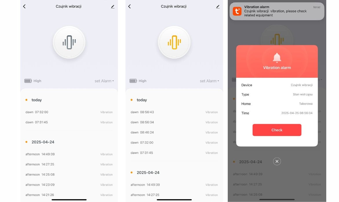 Датчик працює з іншими пристроями Tuya - ви можете інтегрувати його за допомогою сирени, лампи, камери або реле. Завдяки історії виявленої вібрації у вас є повний перегляд попередніх подій - у програмі ви перевірите, коли діяльність буде записана.