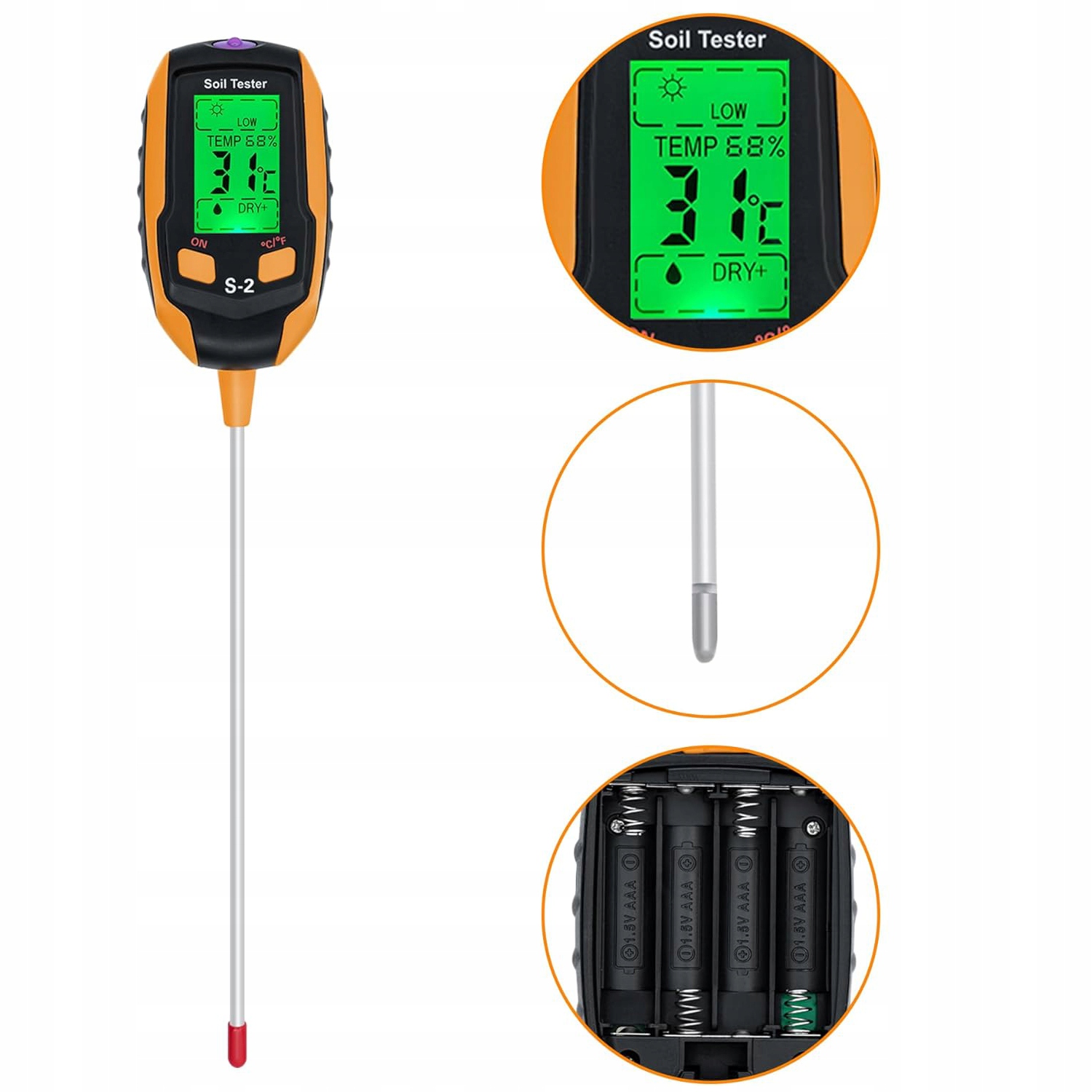 Тестер ґрунту має великий РК-дисплей з підсвічуванням, тому ви можете легко читати параметри навіть в умовах слабкого освітлення. Не можете визначити pH або температуру? Ґрунт необхідно ущільнити перед перевіркою pH, інакше зонд не зможе виявити ґрунт. Рекомендовано вимірювати температуру ґрунту через півгодини після поливу.