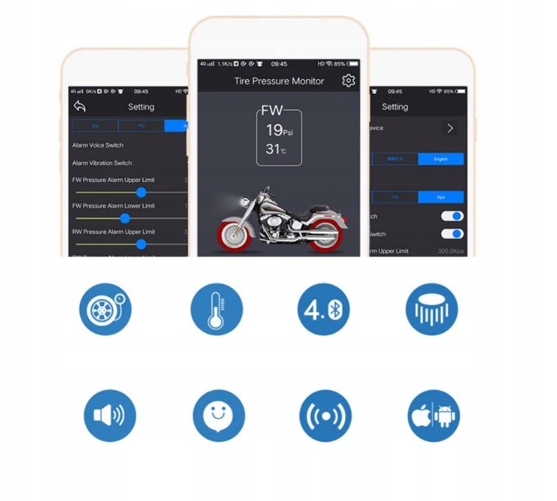 Набір датчиків TPMS забезпечить вашу безпеку на дорозі. Він будеконтролювати тиск і температуру в шинах. Набір надішле інформацію на ваш телефон через Bluetooth протягом 6 секунд після зміни тиску. Програма на вашому смартфоні дозволяє контролювати найважливіші параметри в режимі реального часу одним дотиком пальця.