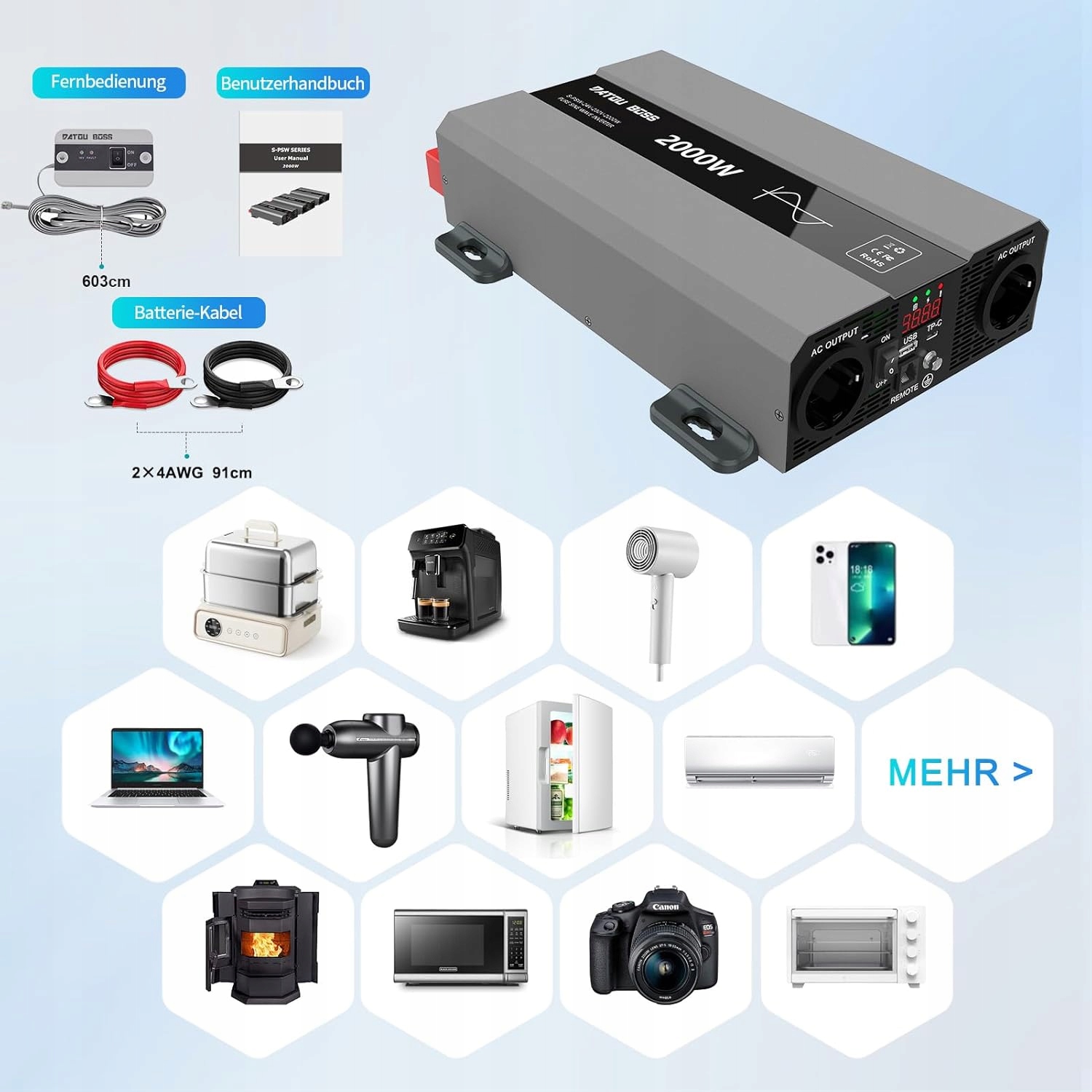 - Багатофункціональний інвертор. Просунута технологія чистої синусоїдальної хвилі забезпечує високоякісне джерело живлення, яка відповідає живленню для захисту та продовження терміну експлуатації обладнання, придатного для внутрішніх телевізорів, холодильників, печей для гранул, ноутбуків, настільних світильників, зовнішніх сонячних енергії, інструментів, автомобілів, вантажних автомобілів, кемперів, кемпінгів та аварійних обладнання.