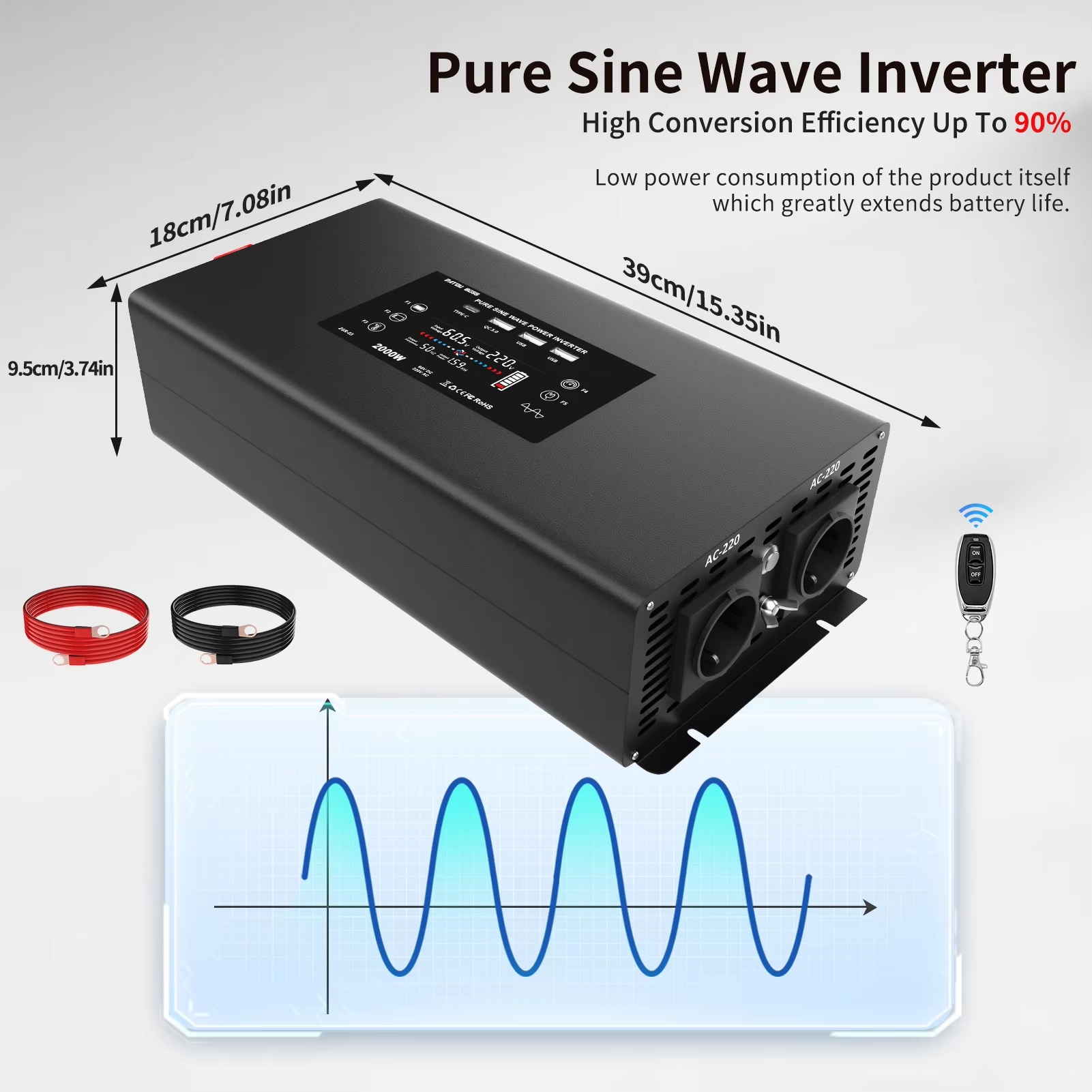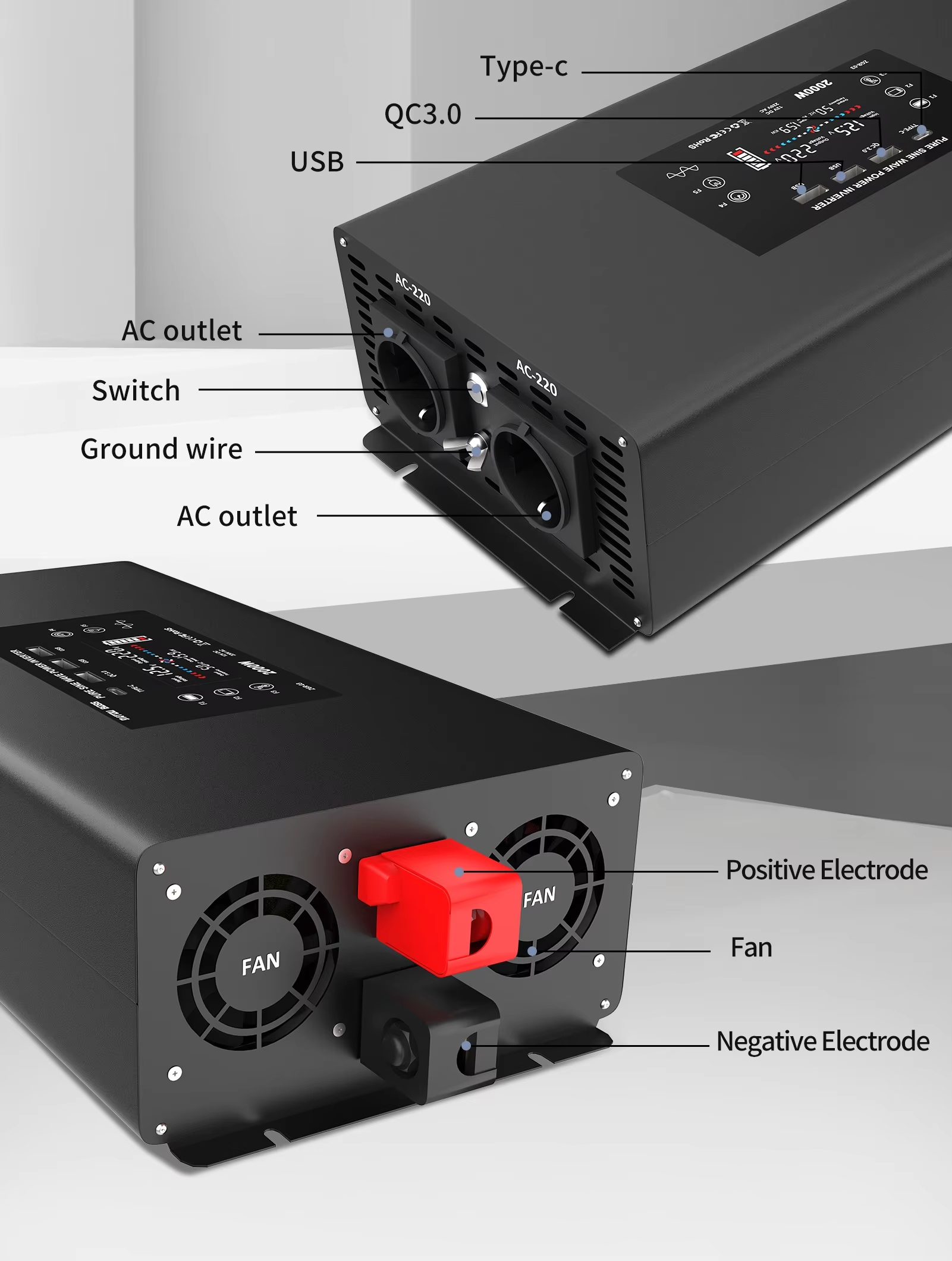 Модель: Тип: Інвертор з чистою синусоїдальною хвилею Виходження напруги: чиста синусоїдальна хвиля безперервна потужність: 2000w Вихідна частота: 50 Гц/60 Гц Сокет: ЄС