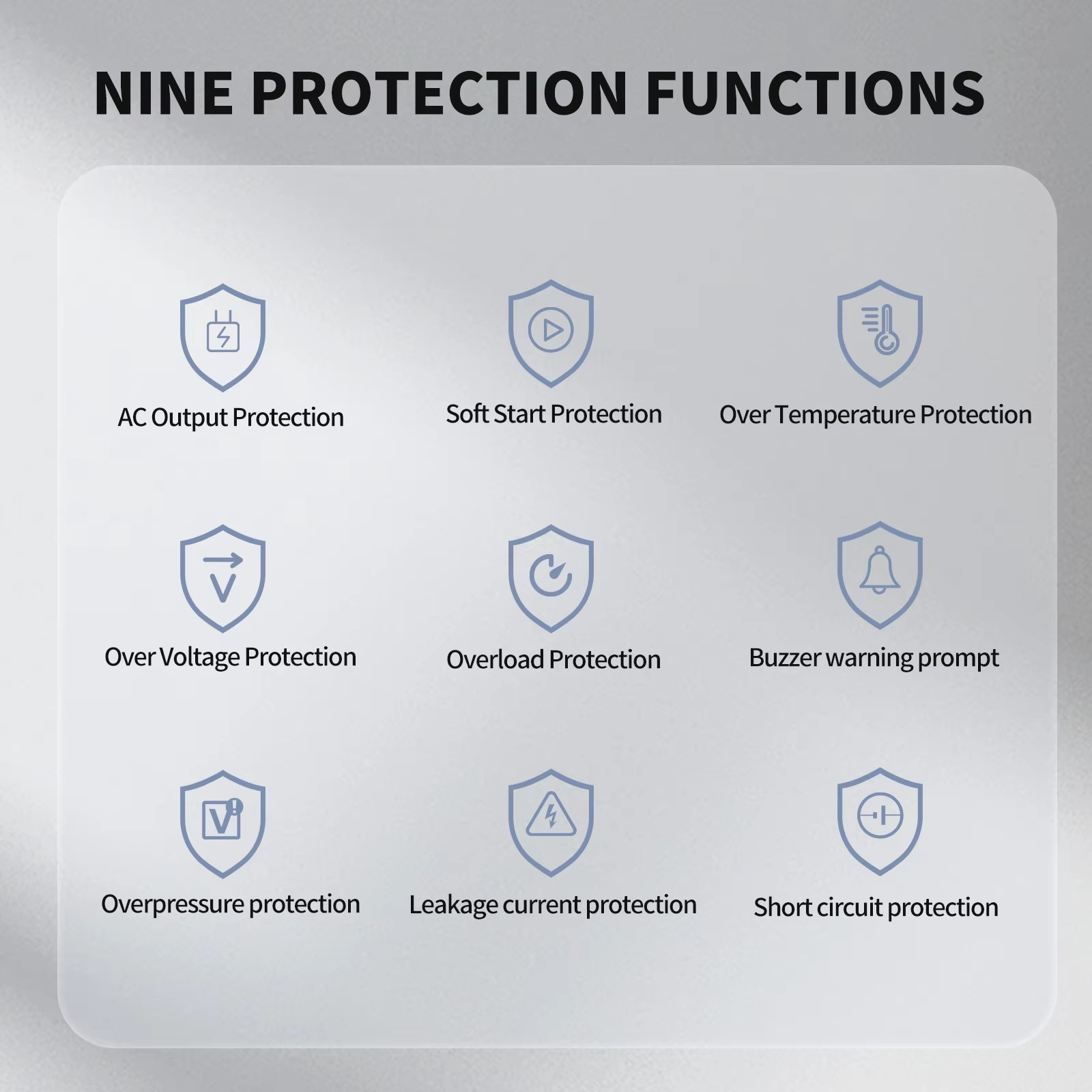 Ефективність обробки трансформаторів DN-03 становить 2300 Вт. Коли потужність досягає 2300 Вт, інвертор автоматично вимикається і запускає функцію захисту від перевантаження. Це означає, що ви можете тривалий час запускати електричні пристрої нижче 2000 Вт і працювати, але пам’ятайте, що краще не використовувати пристрої з потужністю, що перевищує 2000 Вт, для роботи довго. Тому що це інвертор з безперервною силою 2000 Вт.