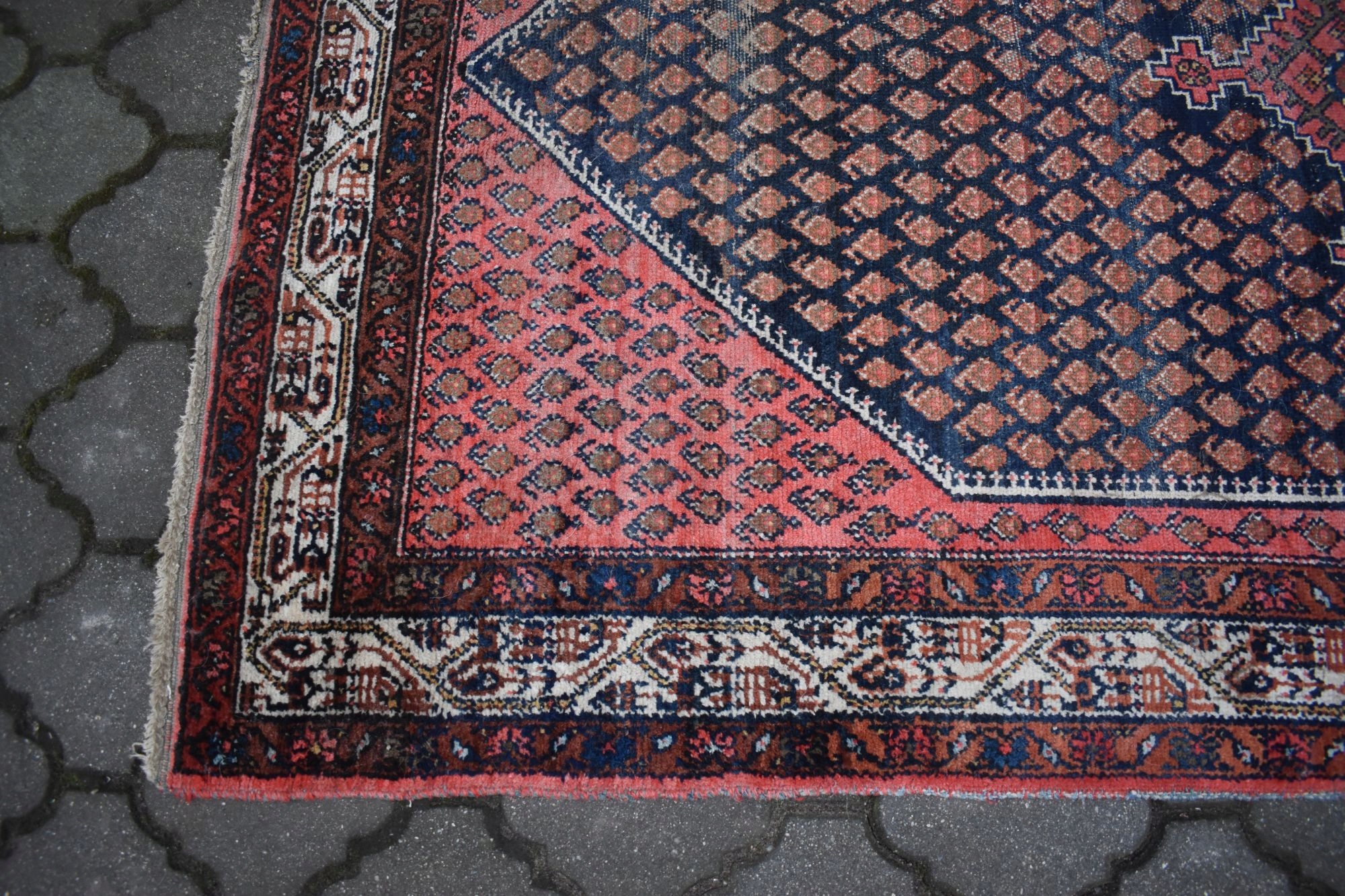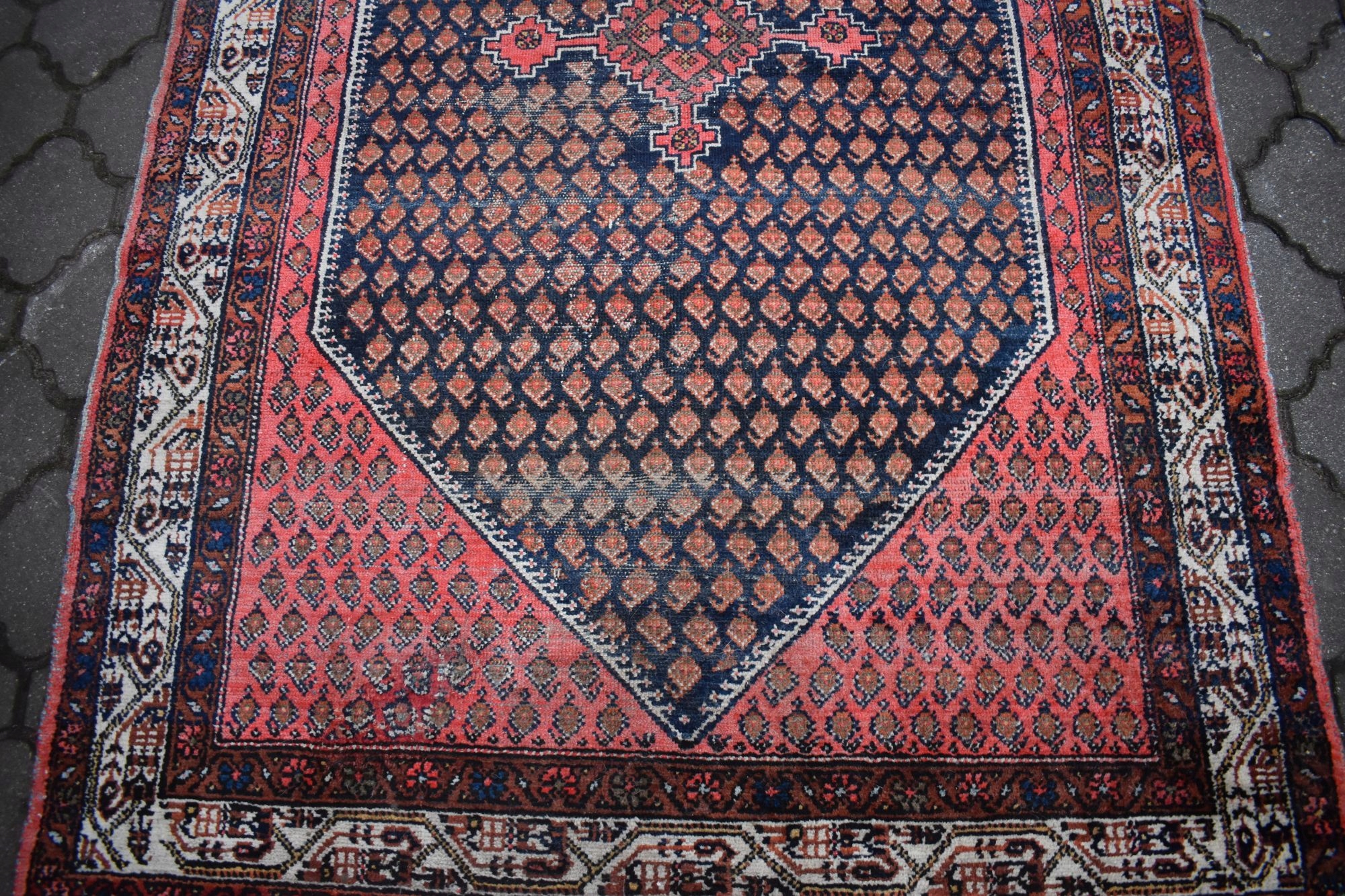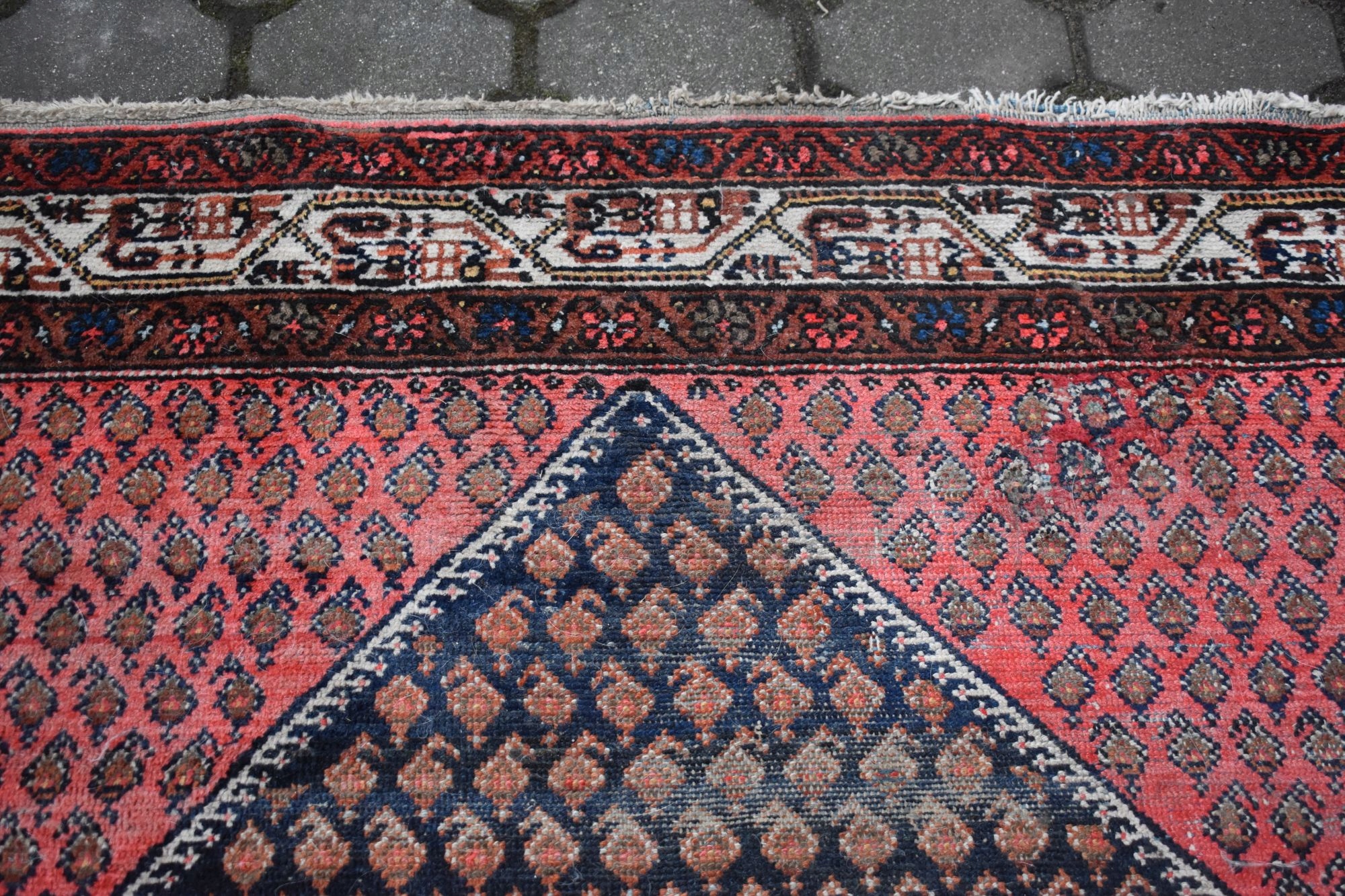 Стан: Килим був у використанні з урахуванням його віку та в хорошому стані - див. галерея. Має брудну та пошкоджену бахрому. Потребує оновлення.