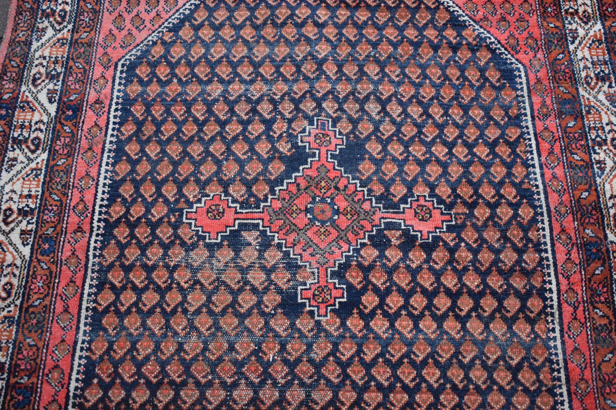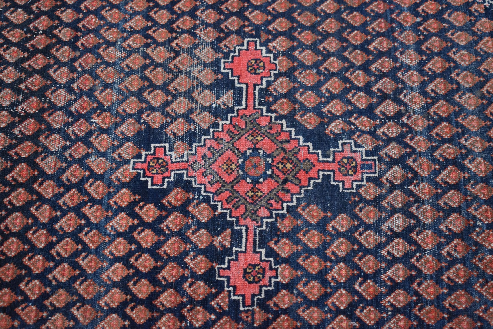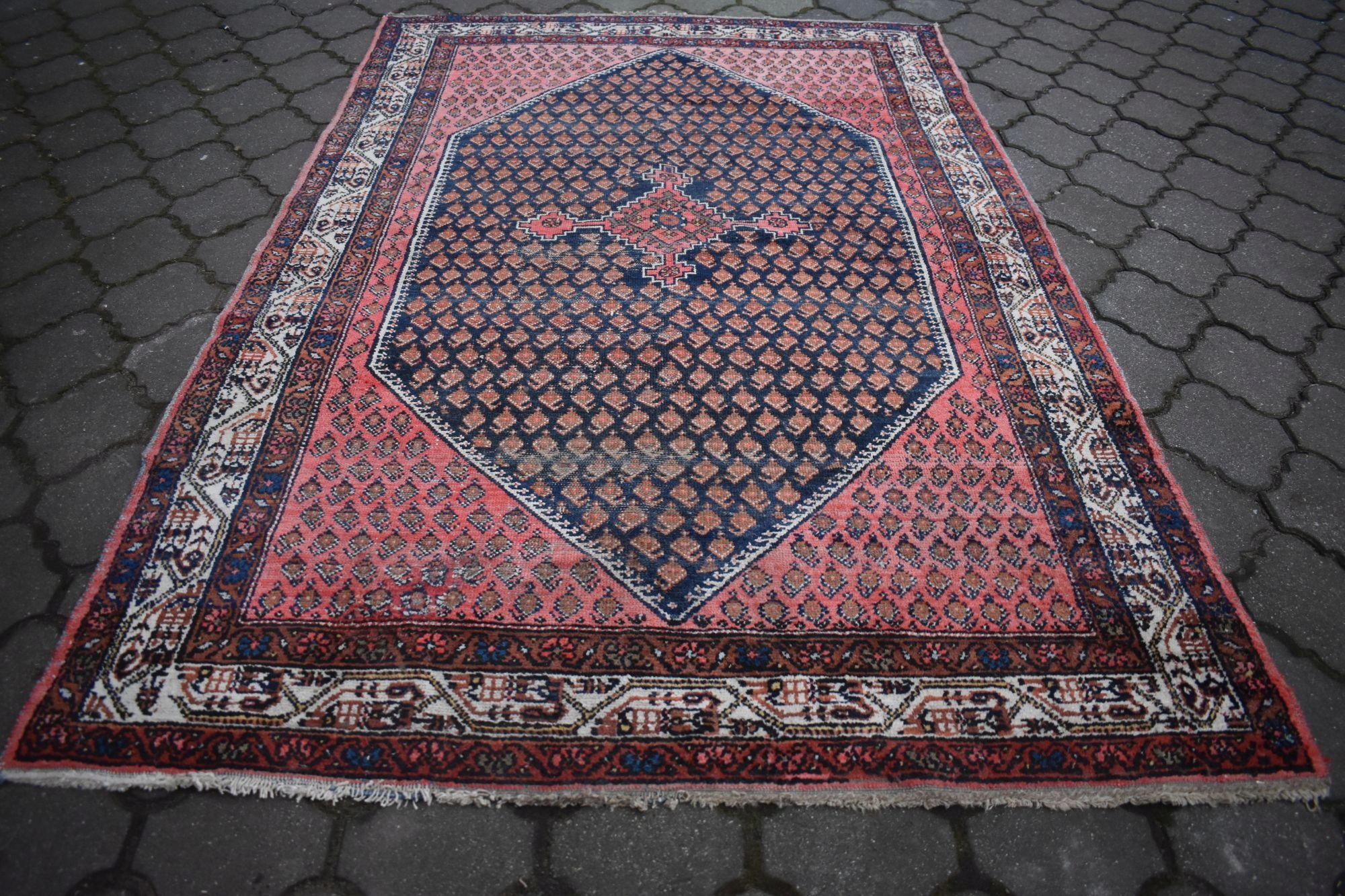 Стан: Килим був у використанні з урахуванням його віку та в хорошому стані - див. галерея. Має брудну та пошкоджену бахрому. Потребує оновлення.