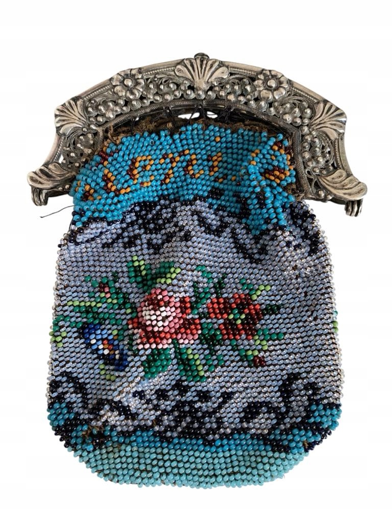 Dawna Portmonetka na Monety Haft Koralikowy Kwiaty Ramka Srebro