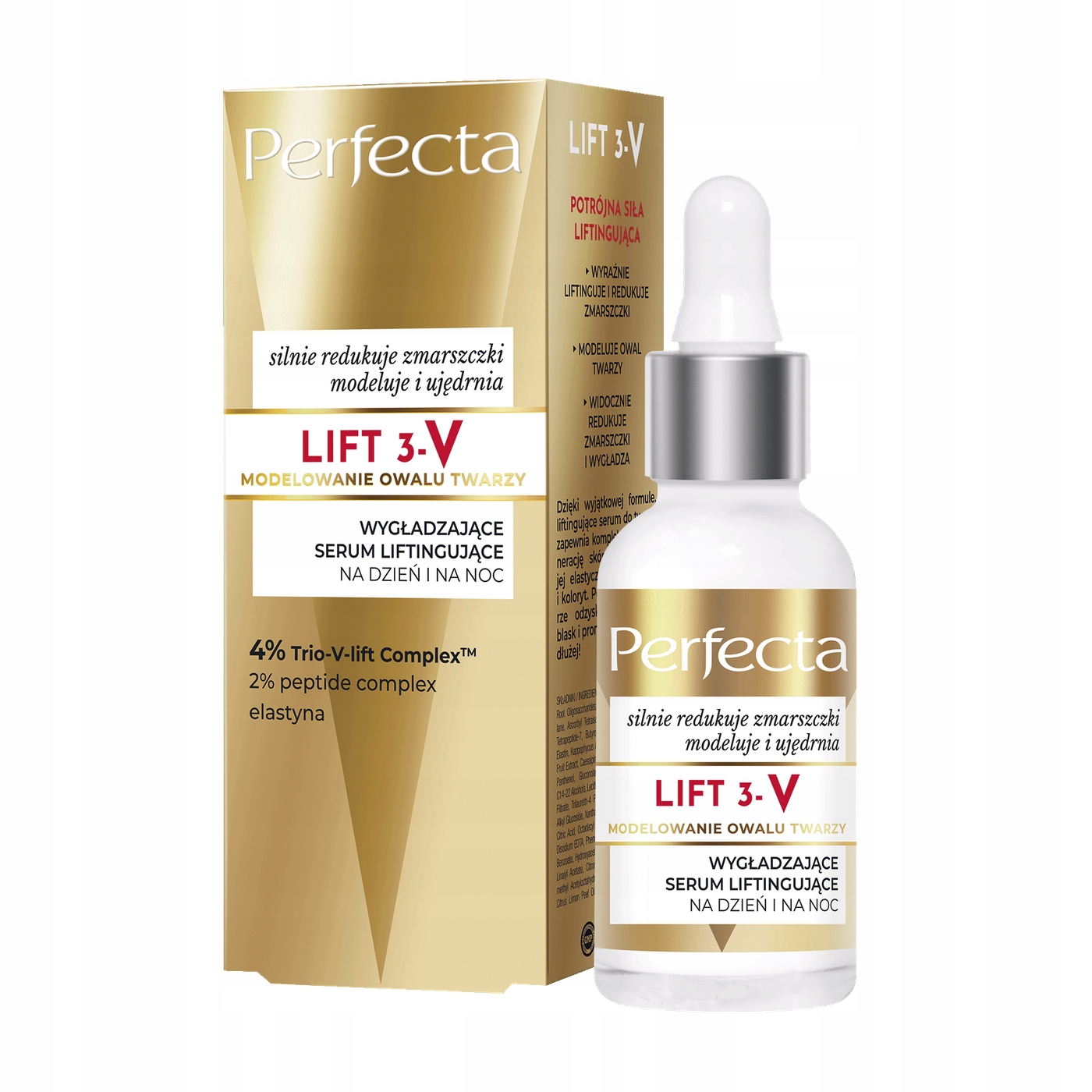 Спосіб застосування: щоранку та ввечері наносити сироватку на очищену шкіру обличчя, шиї та декольте. Для посилення ефекту використовуйте одночасно іншу косметику з лінії Perfecta LIFT 3-V.