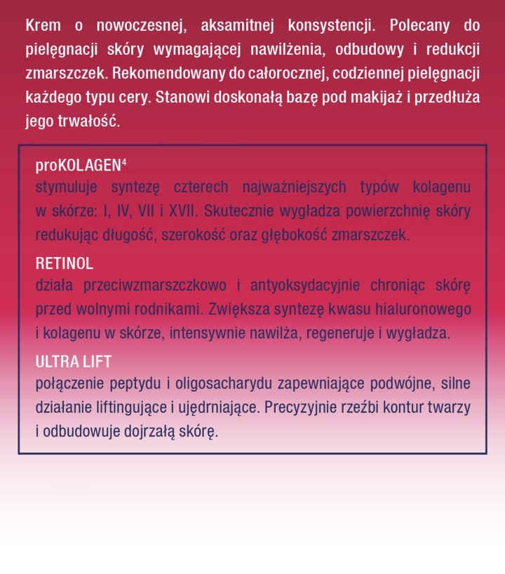 Сильне зменшення зморшок. Реконструкція. Крем із сучасною оксамитовою консистенцією. Рекомендується для догляду за шкірою, яка потребує зволоження, відновлення та зменшення зморшок. Рекомендовано для цілорічного щоденного догляду за всіма типами шкіри. Це відмінна основа під макіяж і продовжує його стійкість. ProKolagen стимулює синтез чотирьох найважливіших типів колагену в шкірі: I, IV, VII і XVII. Ефективно розгладжує поверхню шкіри, зменшуючи довжину, ширину і глибину зморшок. Ретинол має властивості проти зморшок і антиоксидантні властивості, захищаючи шкіру від вільних радикалів. Посилює синтез гіалуронової кислоти та колагену в шкірі, інтенсивно зволожує, регенерує та розгладжує. Ultra lift: поєднання пептиду та олігосахариду забезпечує подвійний, сильний ефект підтяжки та зміцнення. Він точно вирівнює контур обличчя та відновлює зрілу шкіру. Мультиколагенова лінія ретинолу - це унікальна комбінація надзвичайно ефективних інгредієнтів проти зморшок ретинолу та проколагену. Їх синергетична дія стимулює ключові процеси, відповідальні за молодий вигляд. Шкіра зволожена, відновлюється напруга та пружність, а зморшки розгладжуються..