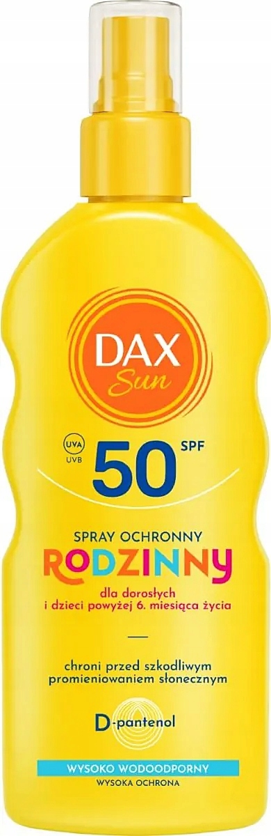 Спробуйте сімейний захисний спрей Dax Sun SPF 50 і захистіть свою шкіру, на яку вона заслуговує. Спеціально створений для ніжної та чутливої шкіри, цей продукт гарантує ефективний захист від шкідливого сонячного випромінювання UVA/UVB. Завдяки водостійкій формулі спрей захищає навіть під час купання, ідеально підходить для використання всією родиною (не підходить для дітей віком до 6 місяців)