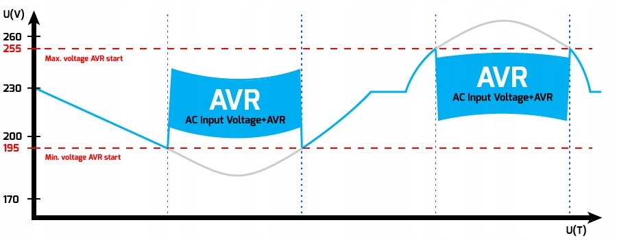 • Якщо напруга становить приблизно 195 В або менше, ДБЖ передасть напругу живлення змінного струму на автотрансформатор (AVR), що призведе до вихідної напруги в межах допустимого діапазону 195 В. до 255 В
