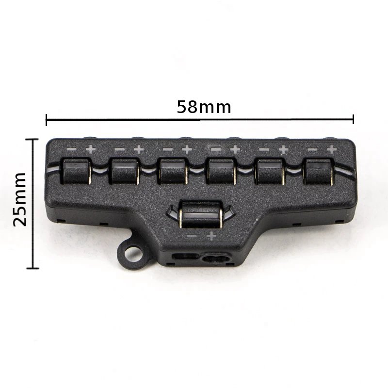 Високоякісний колектор живлення постійного струму. Він має 2 записи ("+" і "-") та 12 виходів (6x "+" і 6x "-"). В ідеалі підходить там, де нам потрібно розгалужувати джерело живлення для декількох пристроїв. Швидкий і суцільний збірник забезпечується пресованими затискачами, що дозволить нам швидко застебнути і розстебнути кабель. Колектор додатково обладнаний кріпильним оком, завдяки якому ми можемо накрутити його на будь -яку поверхню гвинтом або гвинтом.