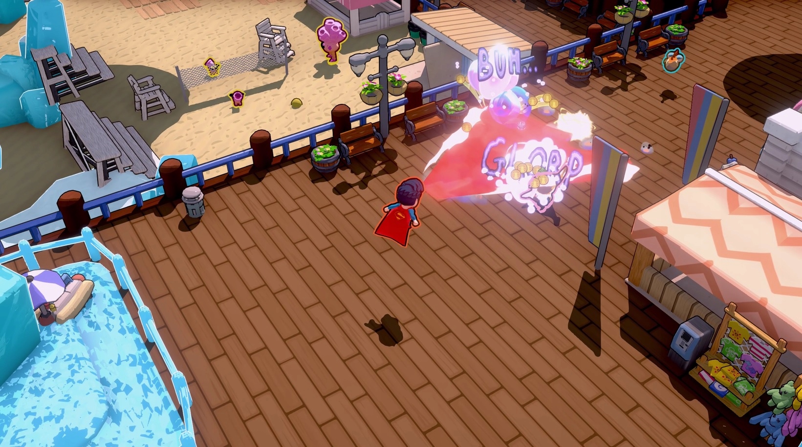 · стають героєм щасливої пристані та відображають елементи елементів та знакових рухів та броні, такі як лазерний зір Супермена, залучаючи правду Wonder Woman та Batman's Batarangs.