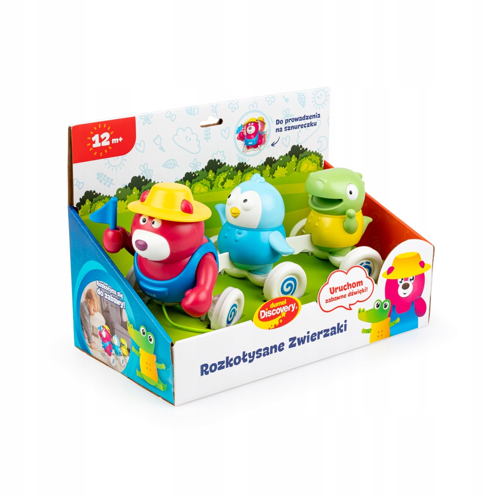 Потяг із трьома веселими пасажирами чекає на поїздку! Іграшка оснащена шнурком для наведення ручки. Під час їзди тварини гойдаються з боку в бік, як і колеса транспортного засобу, які прикрашені візерунком, завдяки чому їх рух створює цікавий візуальний ефект. Потягнувши за шнурок, активуються кумедні звуки та мелодії, які зроблять розвагу ще приємнішою. Продукт призначений для дітей від 12 місяців.