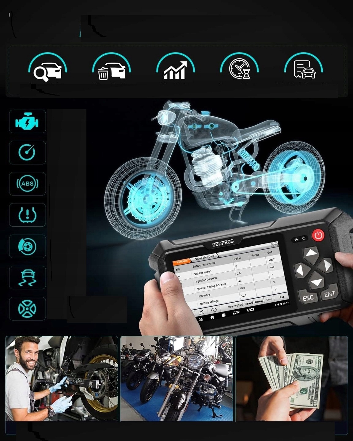- 【Функції обслуговування + Спеціальні функції】 Спеціальні та сервісні функції сканера MOTO100 підтримуються лише двигуном та інструментами, такими як скидання ECU, скидання контролю надання послуг, послуга пробігу тощо (більше інформації можна знайти в путівниках та документах щодо товару). Через проблеми з мотоциклами деякі функції або моделі з року можуть не підтримуватися, тому найкраще перевірити сумісність з нами перед покупкою.