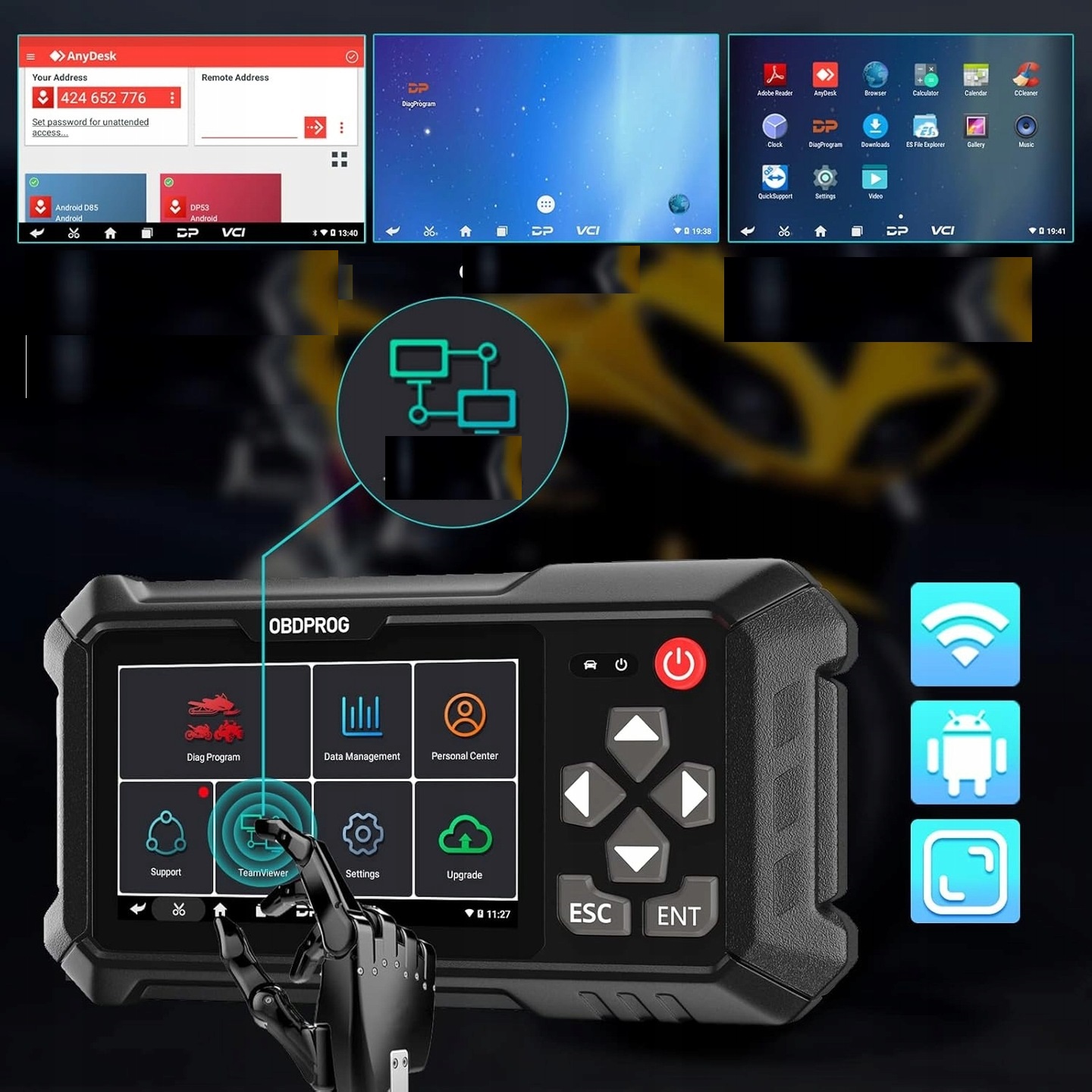 ➤ Конфігурація продукту】 ➤ Ви можете отримати всі діагностичні кабелі для мотоциклів, і вам не потрібно купувати додатково. ➤ Вбудована бібліотека коду DTC дозволяє швидше знайти причину різних кодів несправностей. Wi -Fi з одним дотиком, скріншот з одним дотиком, функцією віддаленого обслуговування з одним дотиком, щоб швидко оновити пристрій. ➤ 5.0 дотики