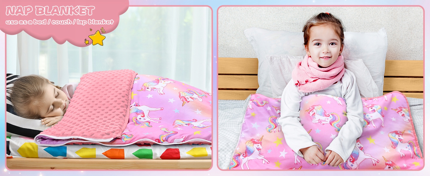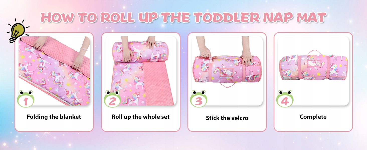 - Широке використання -: дитячий спальний мішок розроблений із застібками на ремінці та ручкою для перенесення, тому ви можете брати його куди завгодно, у приміщенні чи на вулиці. І цей дитячий килимок також є чудовим вибором для денного сну в школі та під час подорожей.