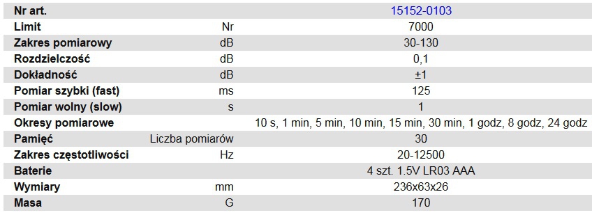 Лімітний цифровий псофометр. Два фільтри з характеристиками A або C і швидке або повільне вимірювання. Фільтр А відповідає частотній чутливості людського вуха і використовується для вимірювань навколишнього середовища. Фільтр C лінійний, використовується для керування машиною. Швидке вимірювання використовується для вимірювання миттєвого значення рівня звуку, який швидко змінюється. Повільне вимірювання дає стабільний результат вимірювання рівня звуку, який змінюється повільно або пульсує. Лічильник може показувати миттєве значення рівня звуку або середнє значення в обраному діапазоні від 10 с до 24 годин. Прилад має пам'ять на 30 вимірювань або може бути підключений до ПК для запису виміряних значень. Функція запису максимального значення. Функція сигналізації, яка сигналізує світлодіодною лампою, коли рівень звуку перевищує або падає нижче встановленого значення. Може бути вказана величина перевищення аварійного значення під час вимірювання. Можливість вибору автоматичного або ручного вимкнення. Функція внутрішнього калібрування 94 дБ. Посібник користувача. Відповідає стандартам IEC 651 типу 2, ANSI 1.4 типу 2.