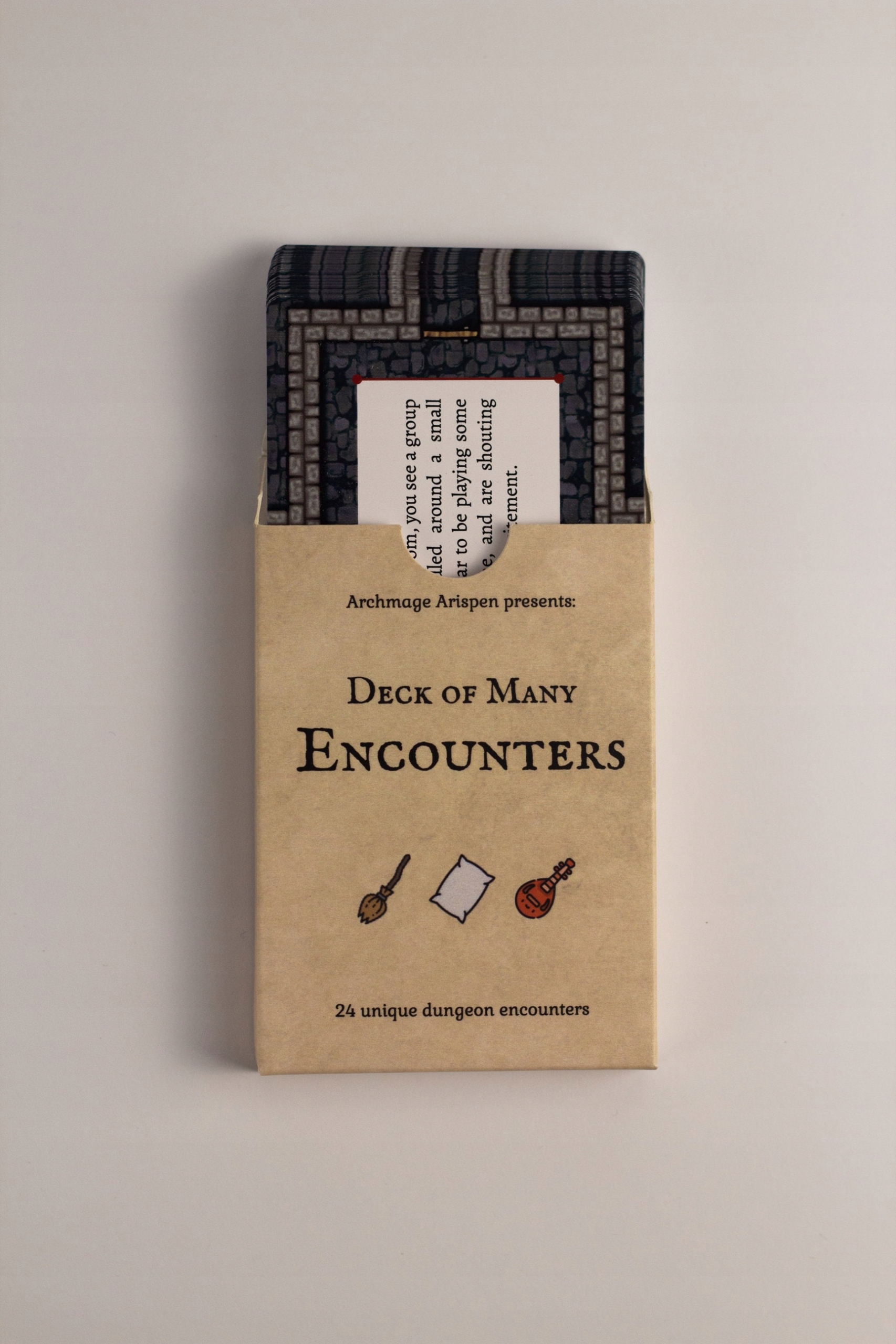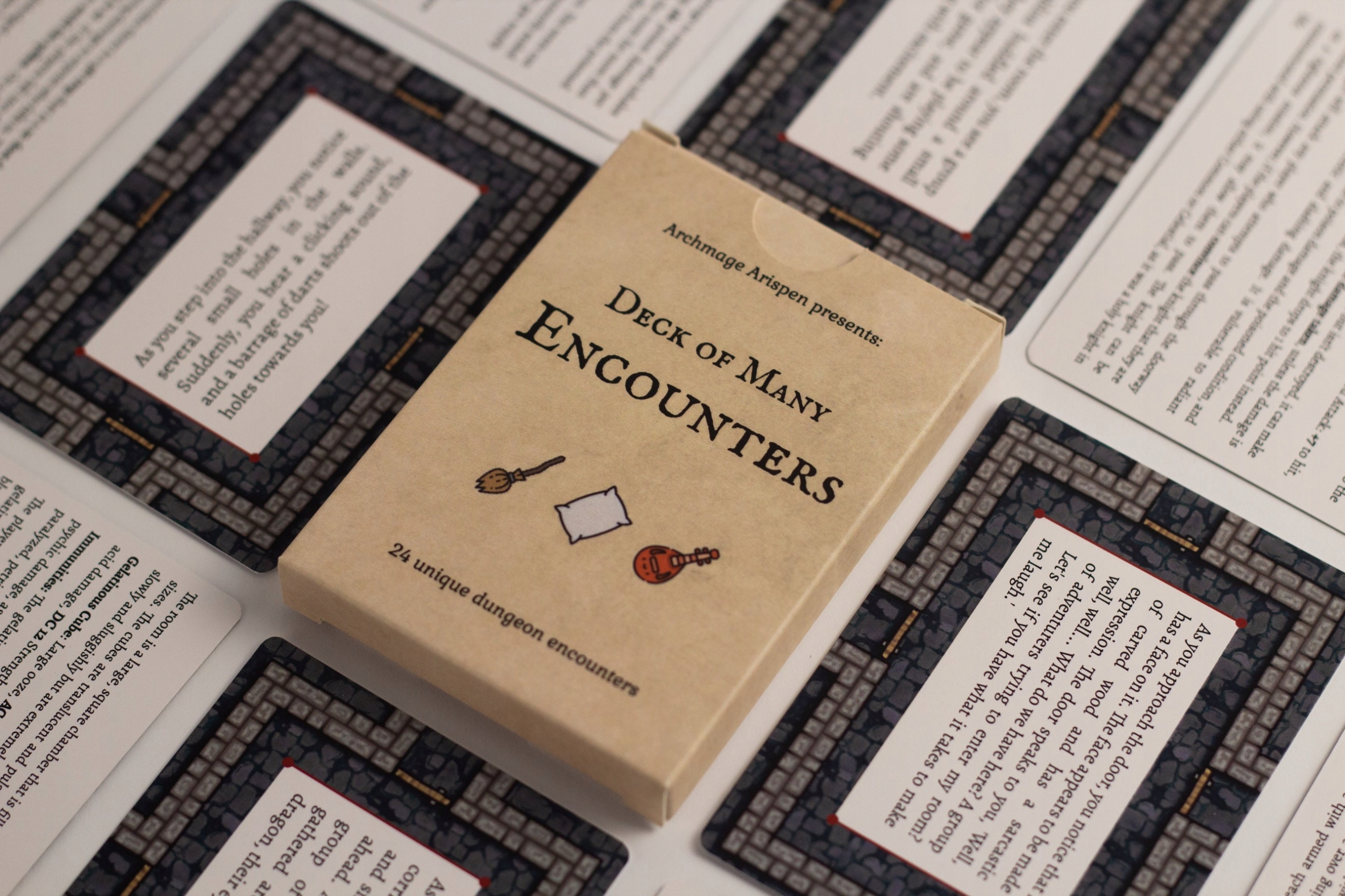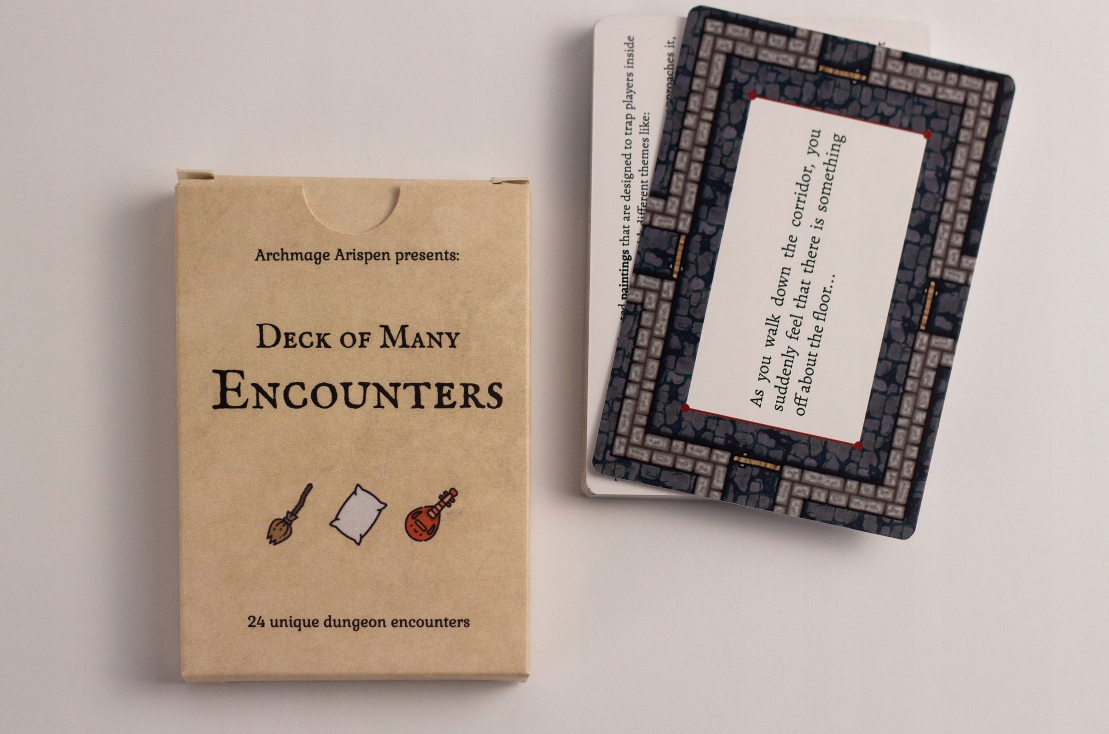 Від виживання в химерних небезпеках смертоносних подушок і мітел до куштування чарівних тістечок або переговорів на місцевості зі сварливими орками, Deck of Many Encounters перетворює кожну гру на пригоду, повну несподіванок.