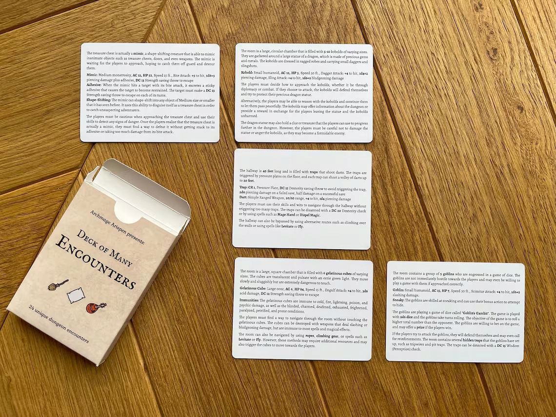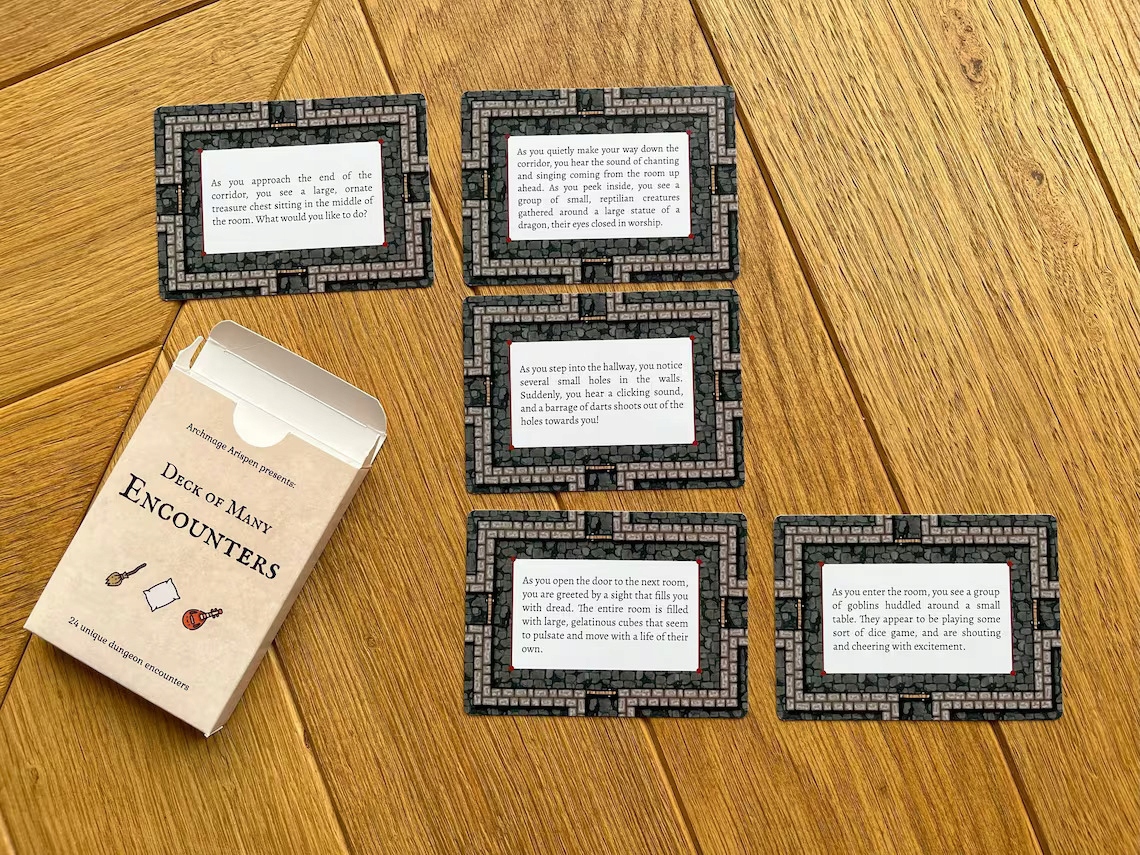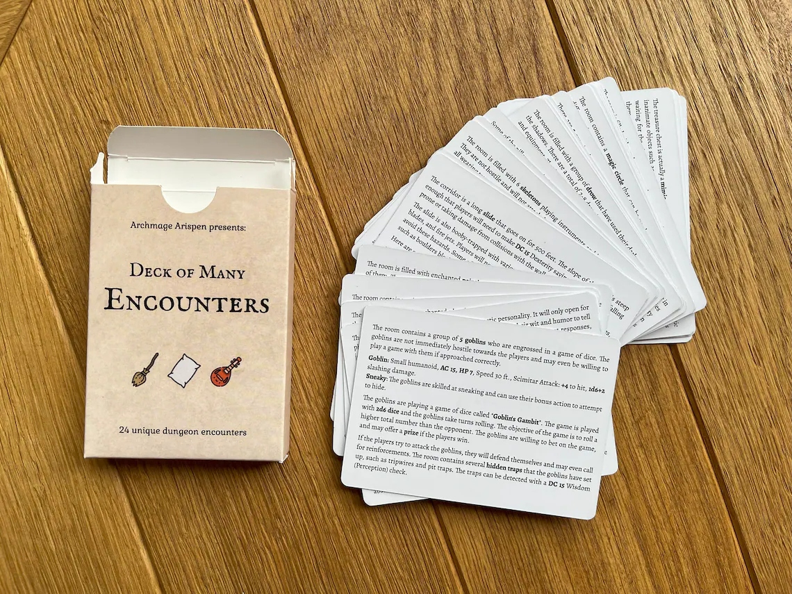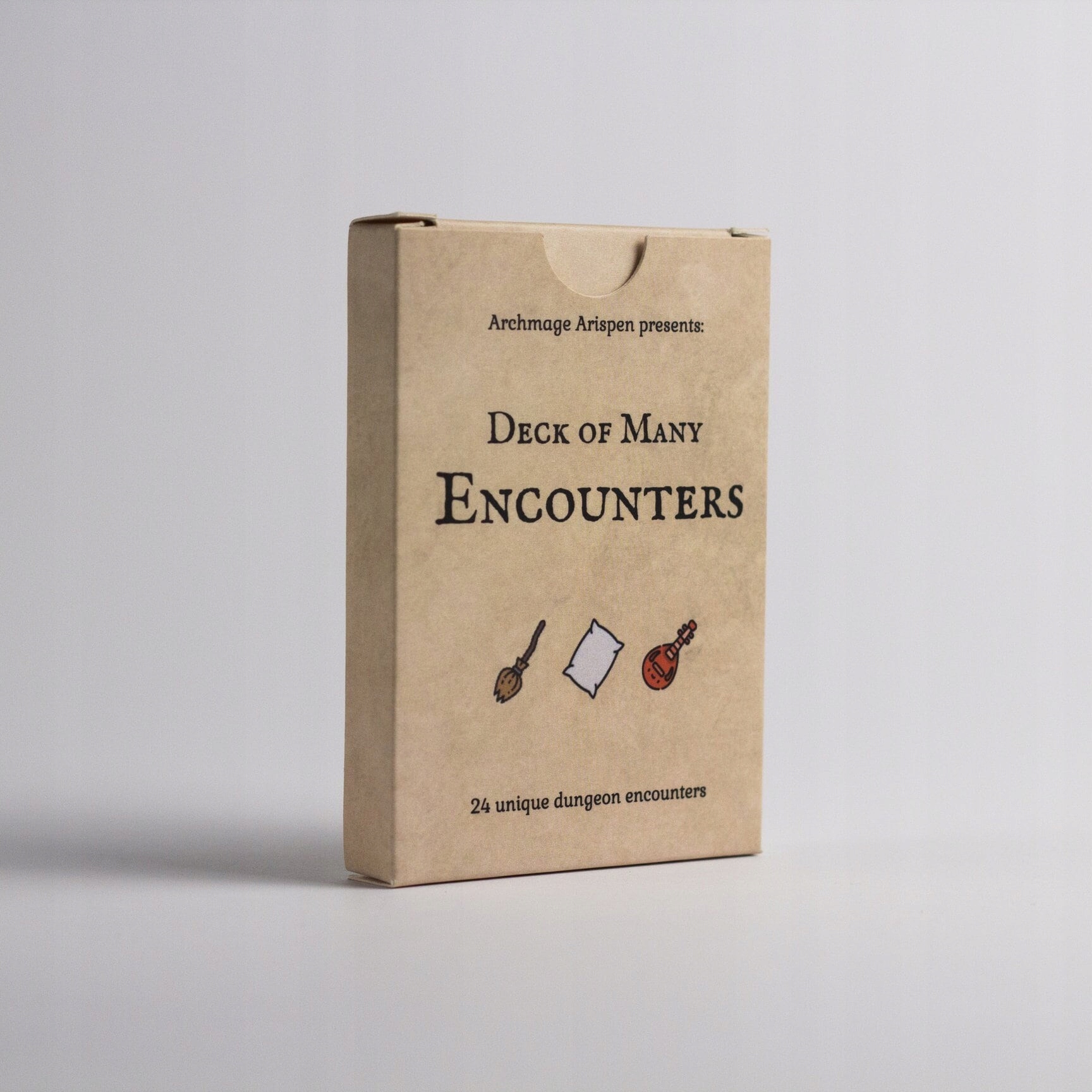 Від виживання в химерних небезпеках смертоносних подушок і мітел до куштування чарівних тістечок або переговорів на місцевості зі сварливими орками, Deck of Many Encounters перетворює кожну гру на пригоду, повну несподіванок.