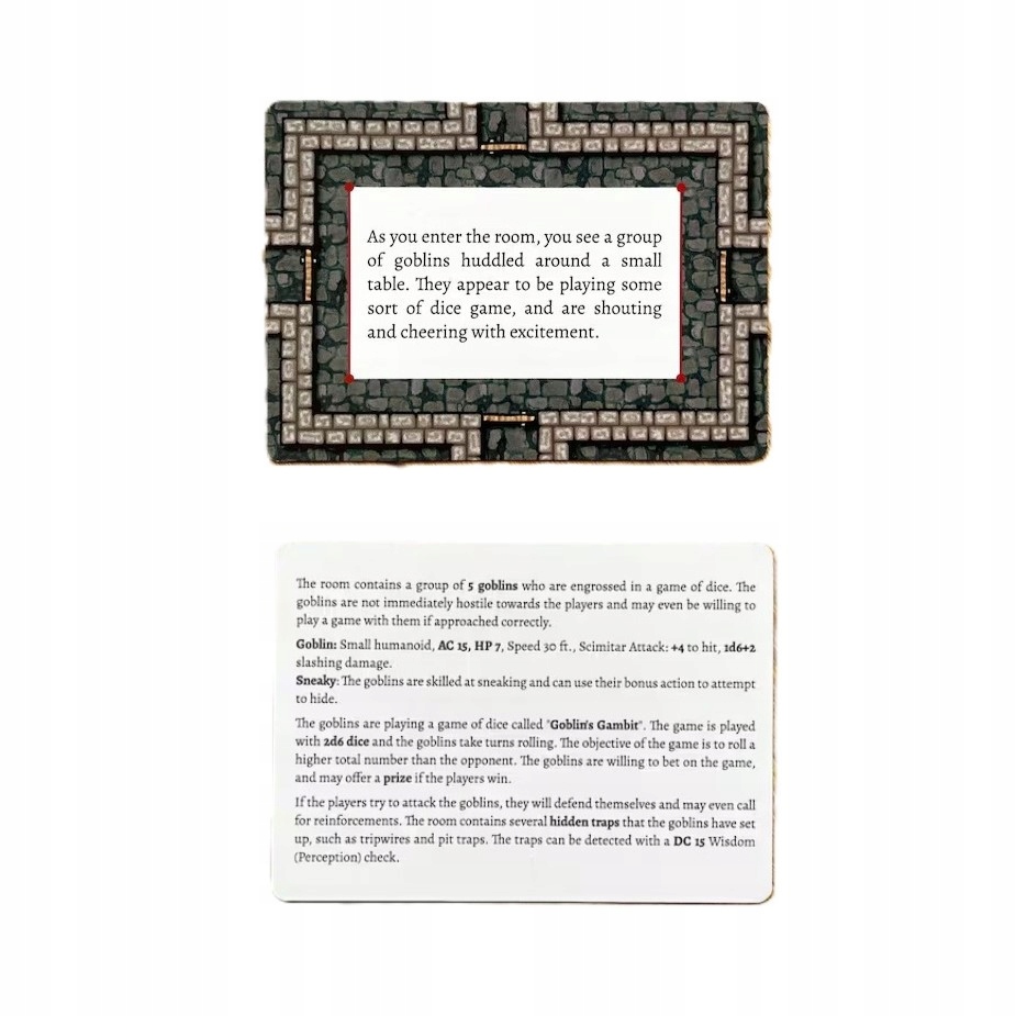 Розкрийте силу випадковості у своїх рольових іграх за допомогою нашої колоди з кількома зустрічами! Цей унікальний продукт містить колекцію з 24 двосторонніх карток, наповнених різноманітними та захопливими протистояннями в підземеллях.