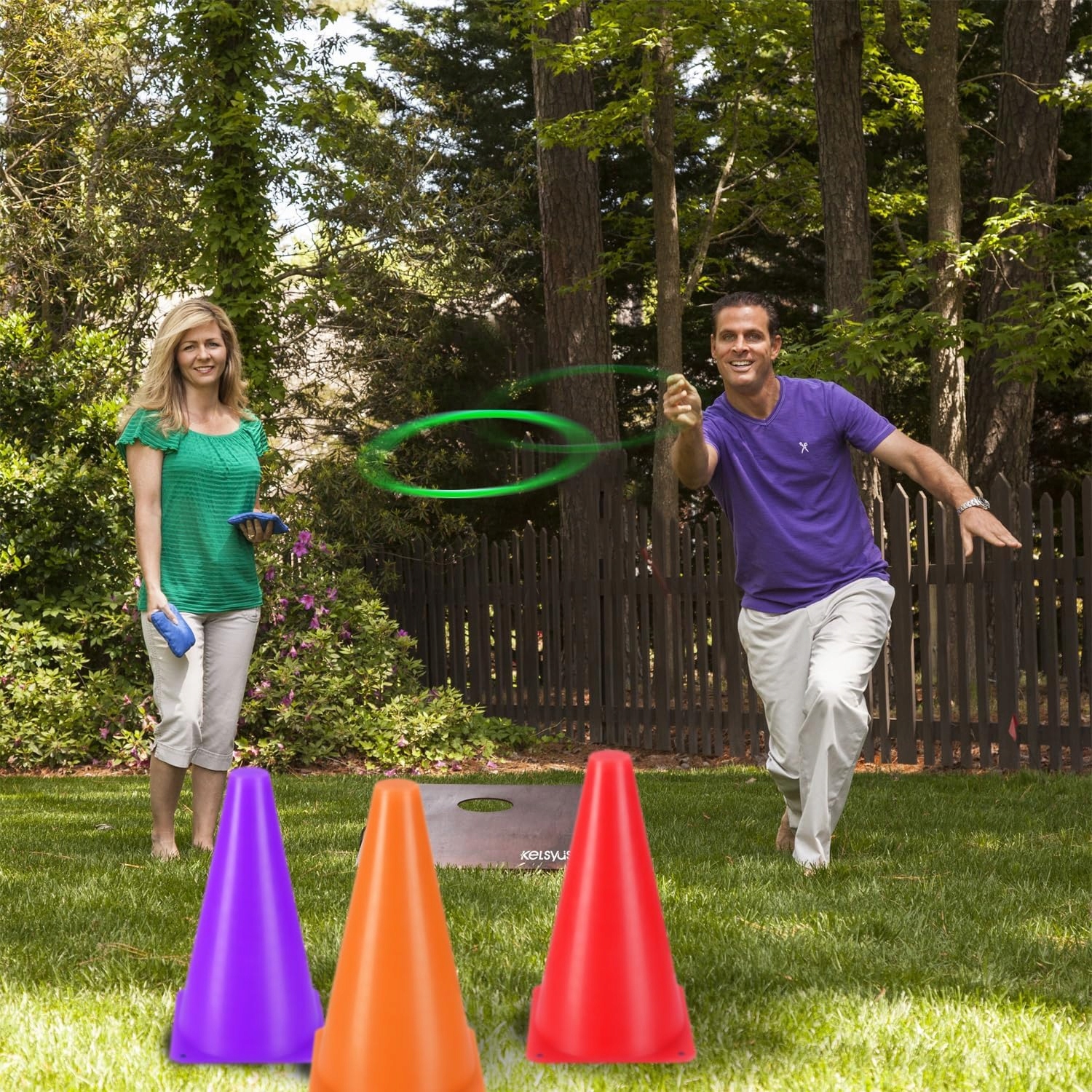 - ✅ 10 ободів - Крім того, є 12 кольорових ободів. Вони легкі та ідеальні для націлювання та введення нових ігор. Ви можете покласти їх на тулі або навколо сумки, щоб створити різноманітні голи та очки, щоб забити.