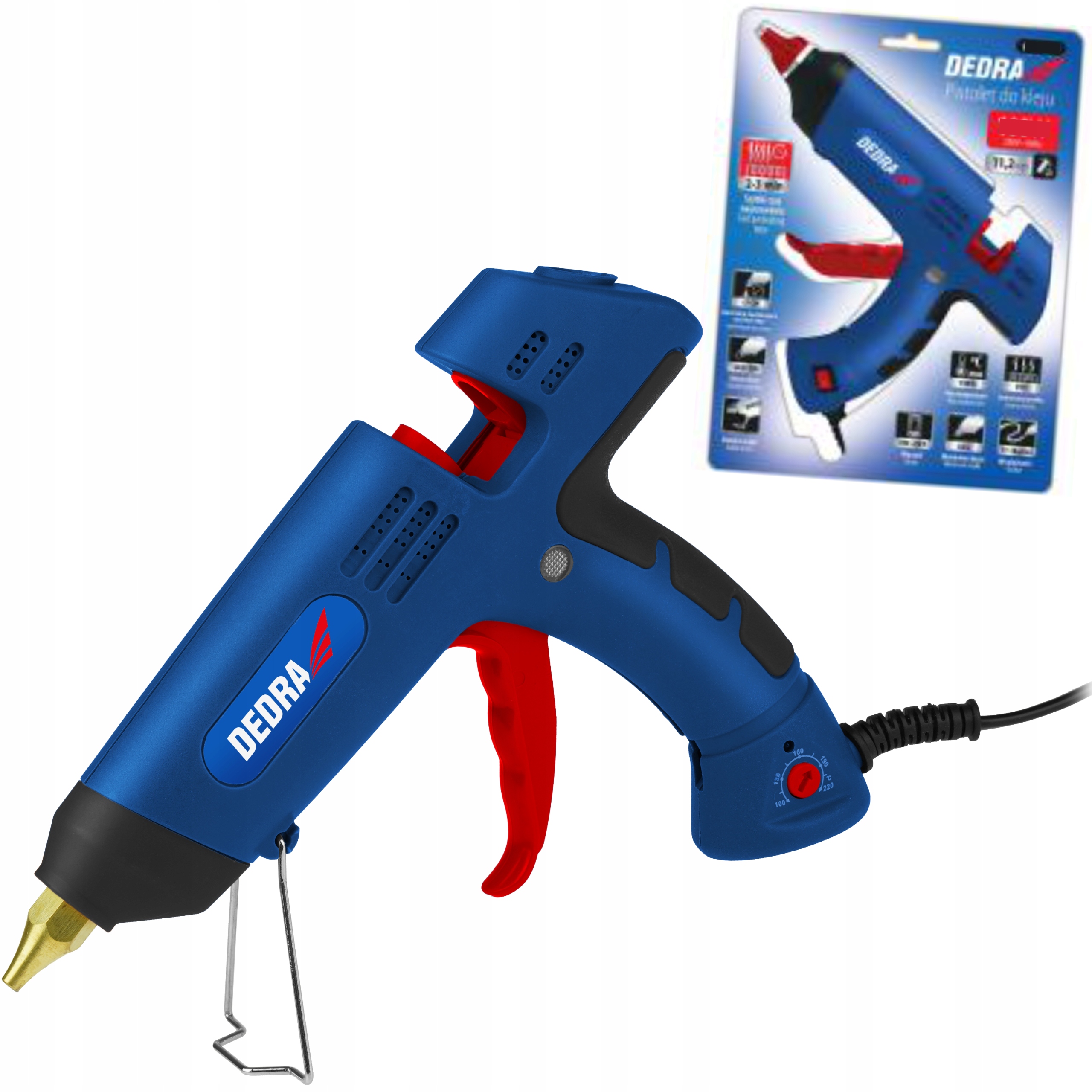 - Клейовий пістолет DEDRA DED7557 має стійку підставку з дроту, що дозволяє безпечно поставити пістолет. пістолет опускається під час роботи, а конструкція насадки запобігає витіканню клею після відпускання курка.