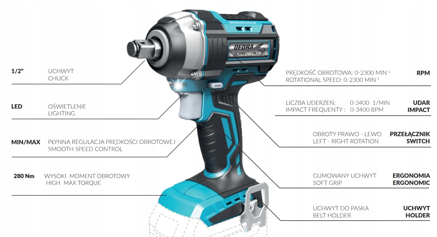 18 В | 280 Нм | 0-2300 хв-1 | уд./хв. 0-3400 1/хв