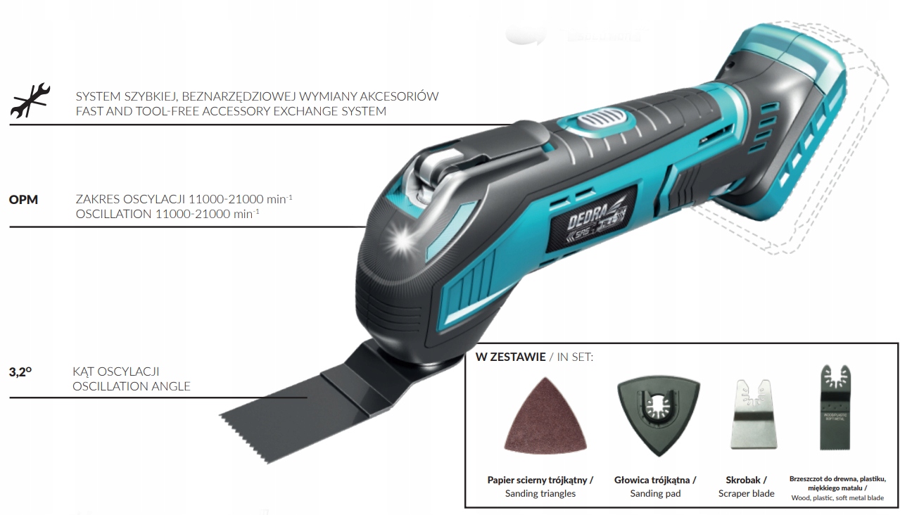 ОДИН АКУМУЛЯТОР ПІДХОДИТЬ ДЛЯ ВСІХ ЕЛЕКТРОІНСТРУМЕНТІВ! Щоб задовольнити сучасні потреби користувачів і уважно стежити за світовими технологічними тенденціями, DEDRA створила абсолютно нову лінійку акумуляторних електроінструментів. DEDRA SAS+ALL – сучасне рішення, серцем якого є акумуляторна система ONE. Завдяки цьому, незалежно від того, чи є ви професіоналом високого класу чи ентузіастом DIY, за допомогою DEDRA SAS+ALL, з одним акумулятором, у вашому розпорядженні є широкий спектр ефективних акумуляторних електроінструментів, які полегшать вашу роботу легше.