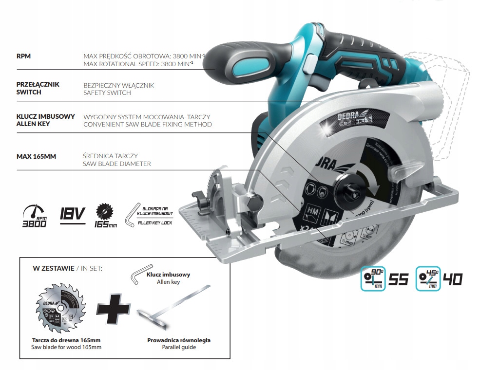 Максимальна глибина різання під кутом 90+55 мм і під кутом 45 = 40 мм.