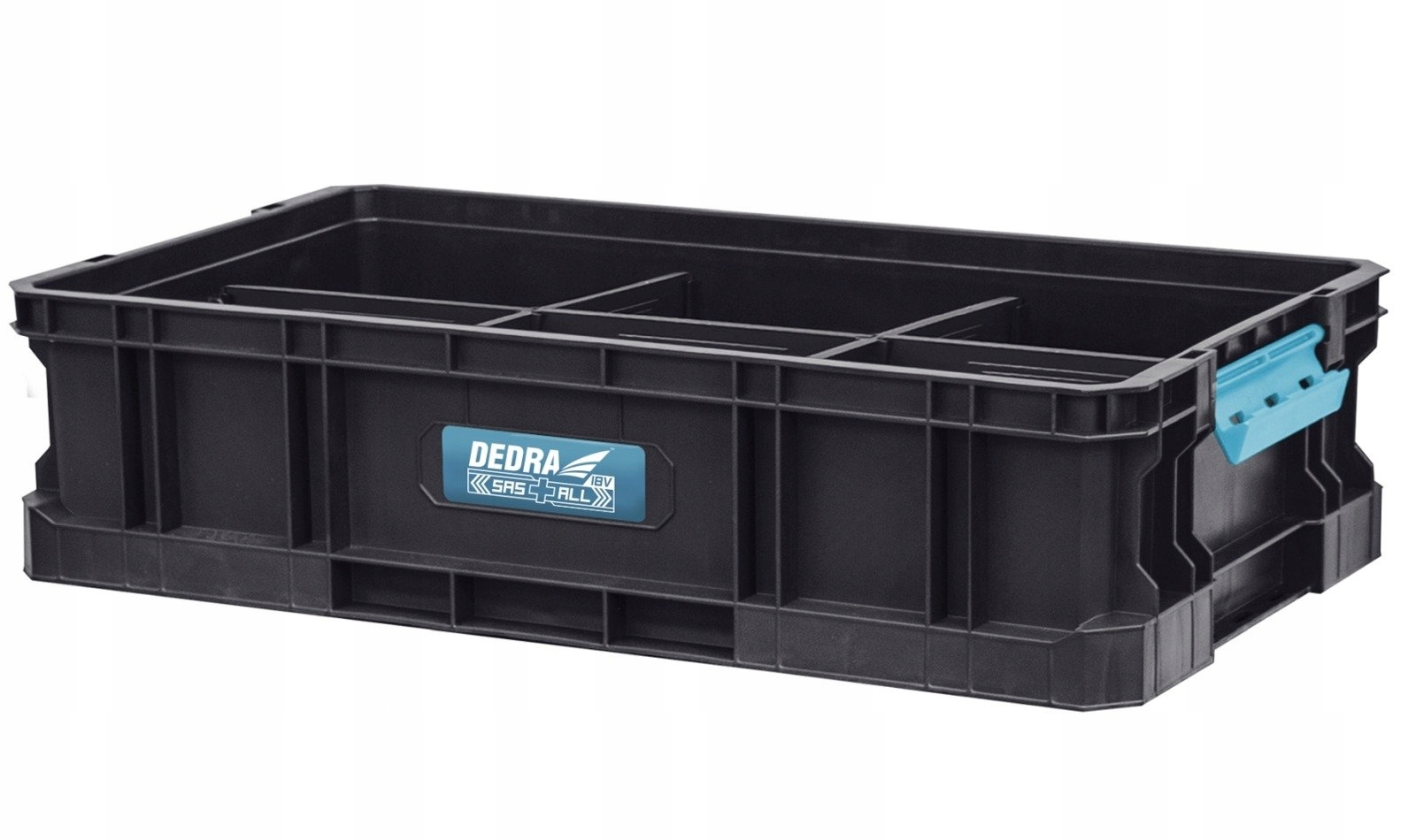 Це одна з модульних коробок транспортної системи DEDRA SAS+. Завдяки оптимально підібраним розмірам коробка задовольнить вимоги як професіоналів, так і любителів домашніх саморобок. Продумана конструкція дозволяє легко налаштувати ящик під індивідуальні потреби. Усередині коробки є п'ять регульованих перегородок, які можна зняти або переставити, щоб створити більш зручне розташування відділень для користувача. Ящик виготовлений з високоякісного матеріалу, що робить його міцним, а щільні ребра забезпечують його високу жорсткість і стійкість до деформації. Поліамідні фіксатори гарантують надійне та довговічне з’єднання з іншими модульними коробками.
