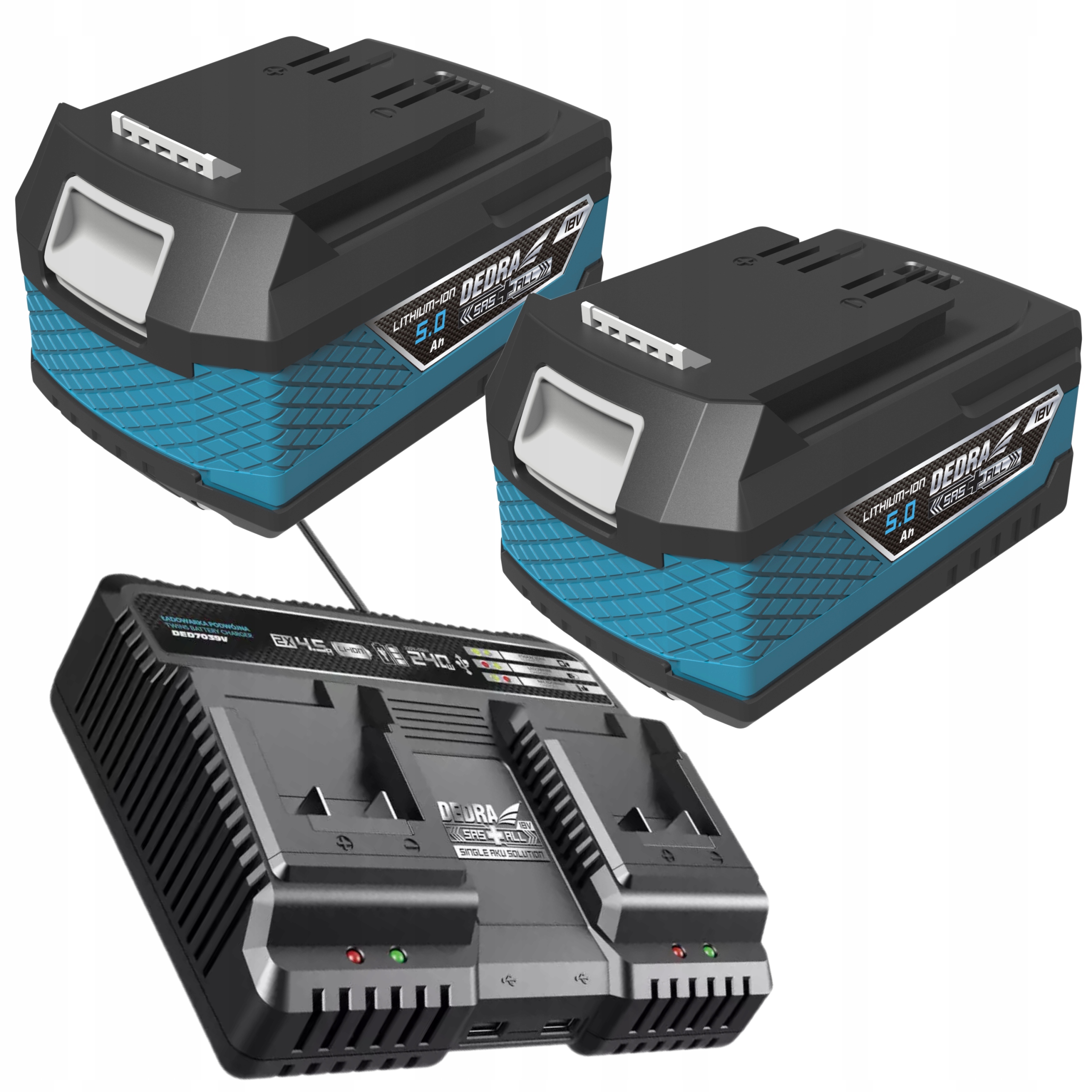 Це зарядний пристрій для швидкої зарядки акумуляторів серії SAS+ALL (DED7032, DED7034, DED7035, DED6936, DED6937). Два слота для акумуляторів дозволяють швидко заряджати акумулятор для електроінструментів SAS+ALL. Вбудовані вентилятори забезпечують захист від перегріву елементів під час зарядки, збільшуючи термін служби батареї навіть при зарядці в спекотні дні. На передній панелі зарядного пристрою є два порти USB для заряджання електронних пристроїв, таких як смартфони, колонки Bluetooth тощо.