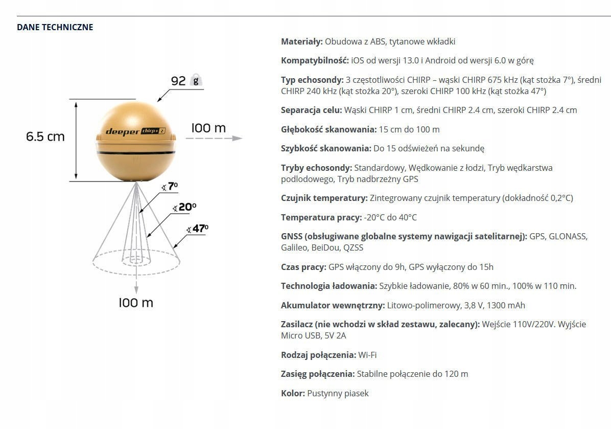 його невеликий розмір і низька вага змусять його легко поміститися в коробку і навіть у кишені. 3 частоти променя, відкрийте місця, де розташована риба, скануючи площу широким кутовим променем, 47 ° (100 кГц). Використовуйте промінь середнього кута, 20 ° (240 кГц), щоб турбуватись до активної точки, яку ви знайшли. Поліпшуйте свій цільовий жанр завдяки дуже детальному куту 7 ° (675 кГц). Потужний акумулятор для швидкого полювання на зарядки та менше турбується про зарядку щебетання+ 2. Він може працювати до 15 годин і заряджати до 100% всього за 2 години.