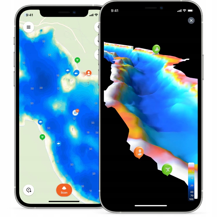 Завдяки розділенню 1 см/0,4 дюйма орієнтуються на приманку під час вертикального джиггінгу. Поверхневий захаращення та шум мінімальні, тому ви можете очікувати точних сонарних показань у дуже неглибокій воді і знайти рибу як близько 15 см / 6 дюймів від поверхні води. З іншого боку, ви зможете розрізнити дно дна у воді до 100 м/330 футів. 4 Батиметрія