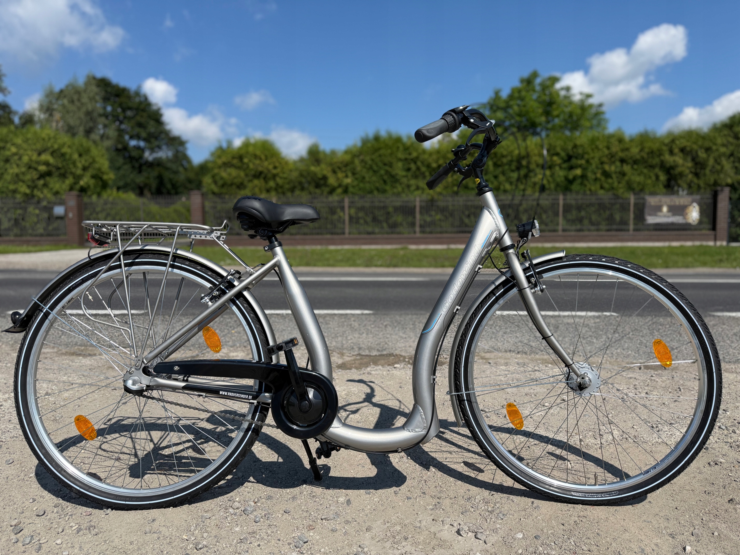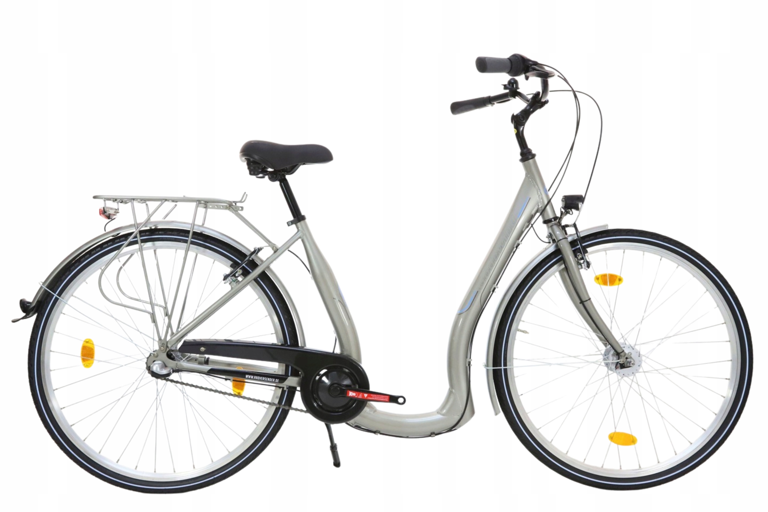 Класичний міський велосипед на рамі з низьким сидінням для людей, які мають проблеми з хребтом і не тільки. Рама має спеціальний профіль для полегшення посадки та висадки з велосипеда. Зручний алюмінієвий велосипед для їзди по місту універсального кольору - сріблястий. Класичний міський велосипед з низькою рамою сидіння для людей, які мають проблеми з хребтом і не тільки. Рама має спеціальний профіль, щоб легше було протягнути ногу через раму.