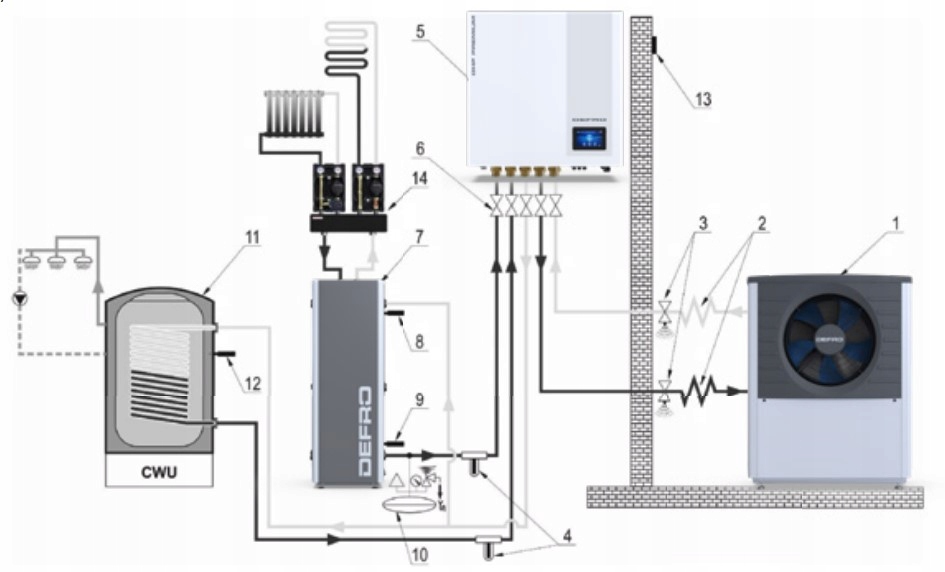11. бак гарячої води, 12. датчик гарячої води, 13. датчик зовнішньої температури, 14. насосні групи з розподільником