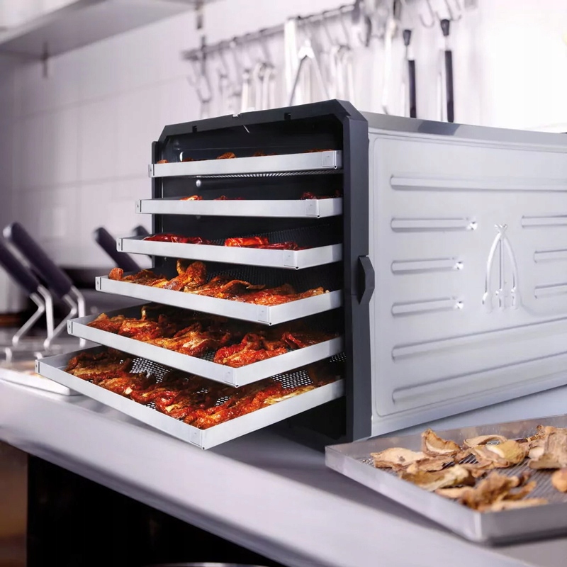 Дегідратор Atacama PRO Deluxe — це інноваційна сушарка для харчових продуктів у найбільш ексклюзивній версії — з нержавіючої сталі. Надзвичайно ефективний і простий у використанні - ідеально підходить як для комерційних, так і для домашніх кухонь. Двигун сушарки розташований у кінці пристрою та забезпечує плавний горизонтальний потік повітря через усі 6 лотків. Завдяки технології "Wilde Flow" усі харчові продукти висушуються рівномірно та досягають ідеальних результатів.