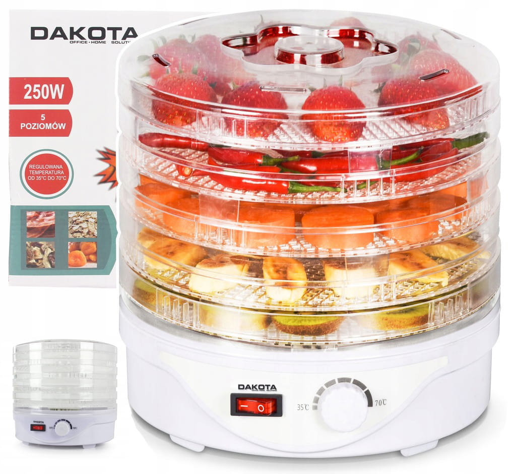 Завдяки високій потужності приладу, яка становить 250 Вт, ми впевнені в оптимальній та ефективній сушінні продуктів. Додатковою перевагою є можливість плавного регулювання температури в діапазоні 35°C - 70°C. Це дозволяє нам відповідним чином регулювати інтенсивність сушіння залежно від продуктів.