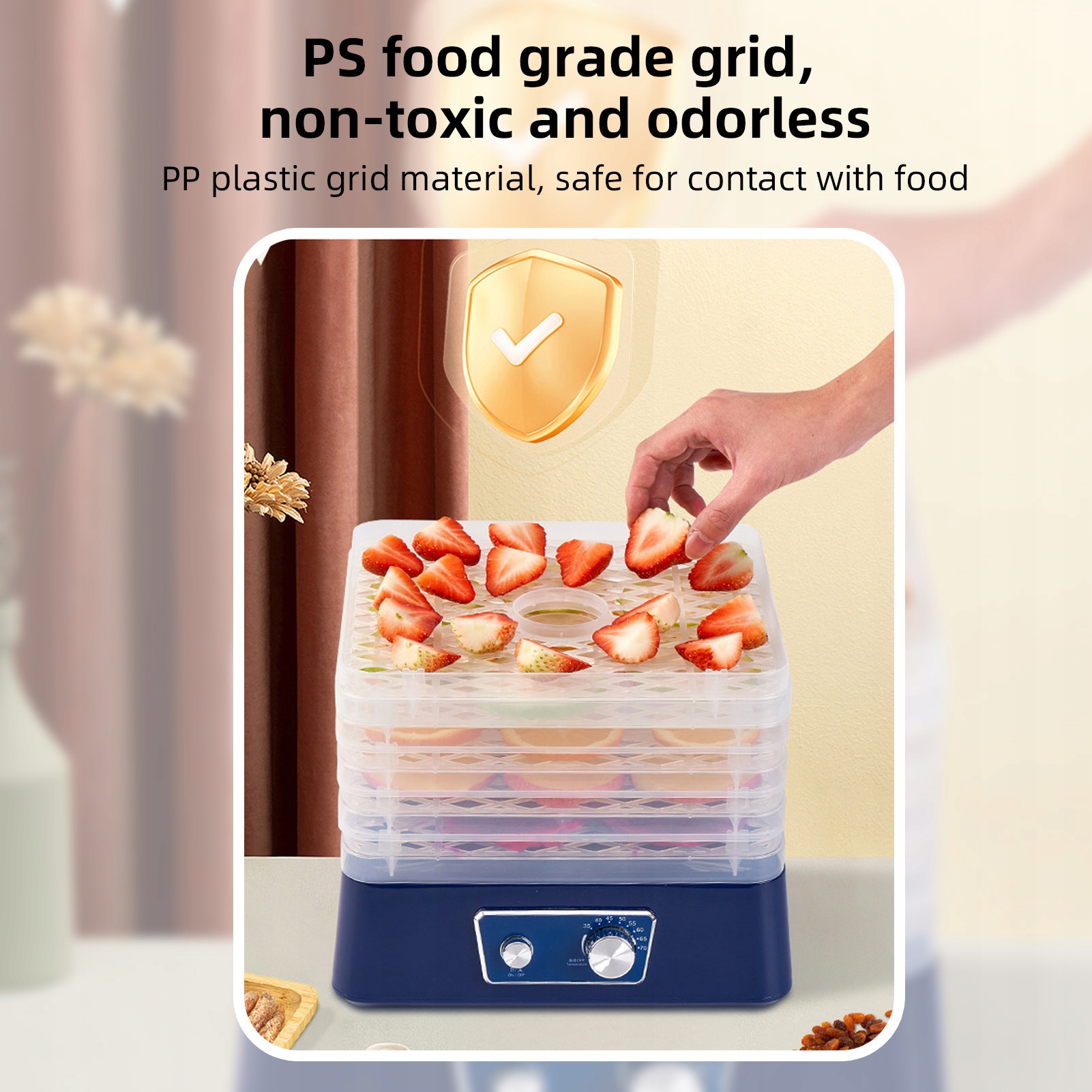 5. 【Стійкий і міцний】 Сушарка для фруктів, виготовлена з харчової решітки для гриля та є основою, безпечна та без запаху. Кути та нижні канавки, що не ламаються, для зручного використання та пересування.