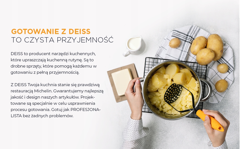 Завдяки інноваційній ручці та широкій тарілці для пюре картопляне пюре більше не є виснажливим і виснажливим заняттям на кухні.