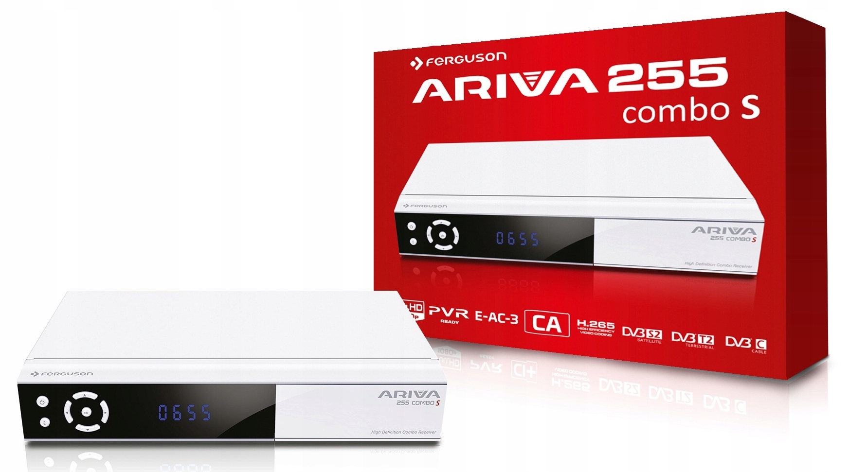 Тюнер для супутникового телебачення Ferguson Ariva 255 Combo, тобто універсальний ресивер, що пропонує доступ як до супутникового телебачення в стандартному DVB-S/S2, кабельне телебачення в стандарті DVB-C або цифрове ефірне телебачення в стандарт DVB-T2 H.265 HEVC.