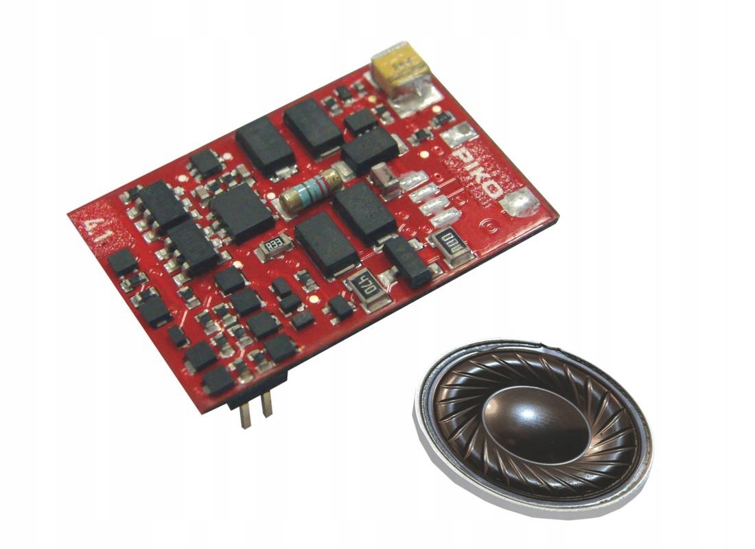 PIKO SmartDecoder 4.1 Sound — це сучасний цифровий декодер для універсального використання з 8-канальним 12-бітним звуком із широким вибором світлових виходів і управління двигуном струм на рівні 1.1 A. PIKO SmartDecoder 4.1 Sound працює в цифровому форматі DCC з Rail-ComPlus®, Motorola® і Selectrix®, сумісний з mfx, а також може використовуватися на моделях з аналоговим живленням. PIKO SmartDecoder 4.1 автоматично розпізнає режим роботи. Підтримує до 44 функцій. Ви можете індивідуально активувати типові звуки локомотива та відомі на залізниці звуки, такі як звуки двигуна, звуки руху, сигнальні сирени, писк гальм, станційні оголошення, розмови з машиністом під час маневрової роботи та багато інших. Звуки також доступні в аналоговій версії (лише звуки двигуна).