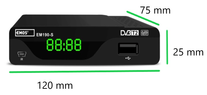 Завдяки невеликим розмірам цю приставку EMOS EM190-S можна дуже зручно розмістити на задній панелі телевізора, роблячи її непомітною. Потрібно лише підключити зовнішній ІЧ-датчик (кабель 1 м), запрограмувати універсальний пульт і вимкнути передню панель в меню, щоб вона не заважала телевізору. Тоді ми використовуємо лише один пульт і навіть не помічаємо, що у нас увімкнено декодер. Приймач, звичайно, також містить вбудований датчик ІЧ-сигналу, і якщо приймач класично встановлений під телевізором, від’єднувати зовнішній ІЧ-датчик не потрібно.